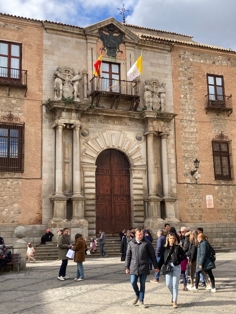 Next stop was the Sinagoga Santa Maria la Blanca, a building that had several ‘owners’ over the centuries and the only building that had significant security, and a screening in place.We learned later that the security has been installed only in recent months (and fortunately there have been no incidents). This was the main synagogue in Toledo’s Jewish quarter, dating from the late 12th century. It ceased being a synagogue in the 15th century and was converted into the church of Santa Maria la Blanca. This was the simplest of the buildings we visited. The walls had lovely ceramic tile decorations, with the stucco capitals decorated with intricate swirls, sashes and pine cones, the latter being a symbol of the unity of the people of Israel. The rooms to the side of the main room contained explanations of the history of the Jewish population of Spain, and of the Jewish religion. It was very comprehensive, we needed a whole day to do it justice and take in the story of Jewish Spain.