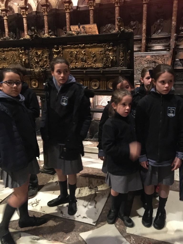 The choir section was fascinating: seats ( just 3 tongues, really) are designed to encourage the choristers to stand throughout. Interestingly, the conductor’s stand has its back to about a third of the choir, which would not suit some conductors we know, but the style probably would (and the school kids).