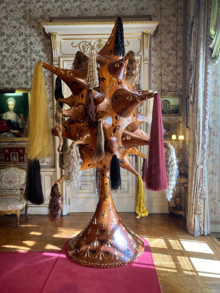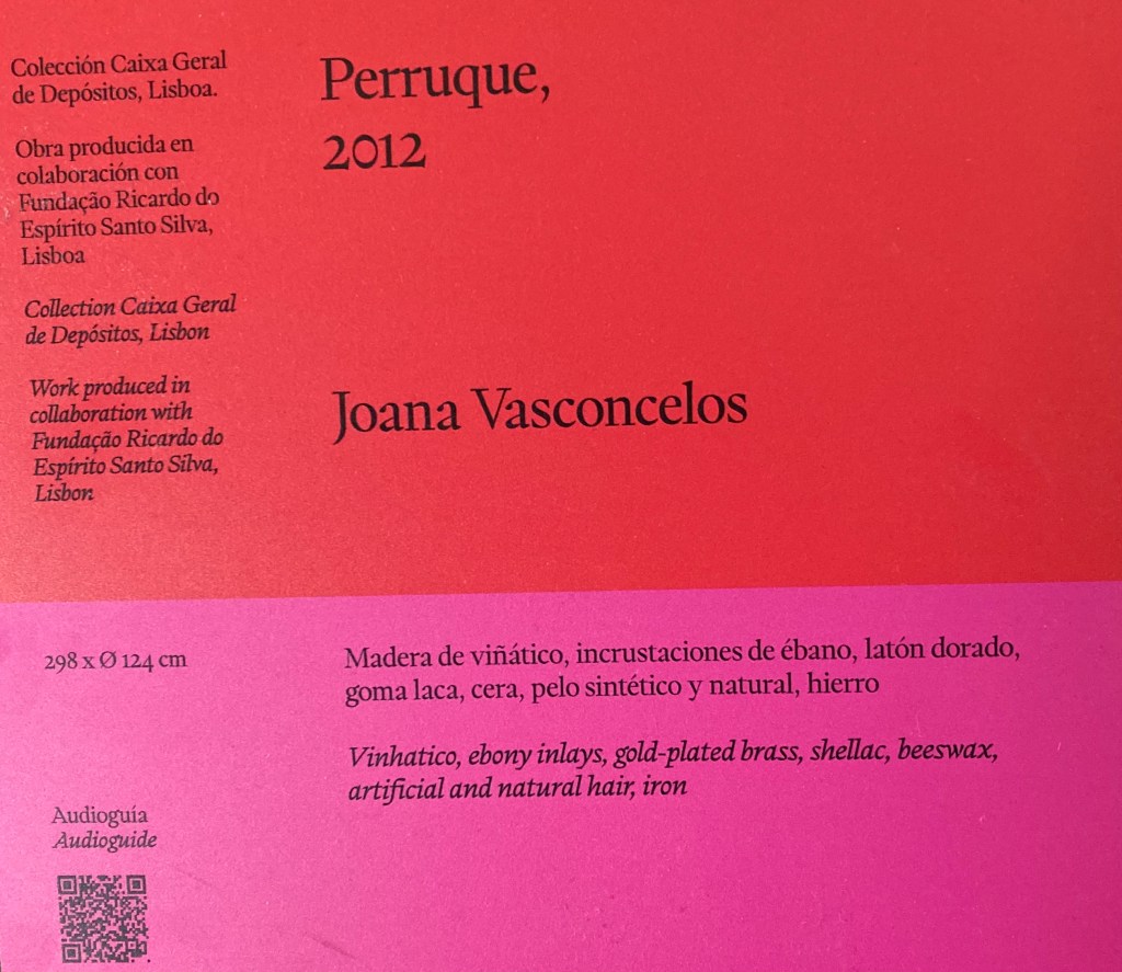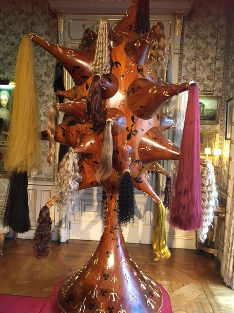 At the hair installation Perruque there was reference to some human hair being used; T asked the attendant ‘Which one is human hair?’To which the answer was, ‘I don’t know’. Whereupon T commented on the attendant’s terrific hair and said, ‘You’ve been to the same hairdresser!’ There was a shared laughter & the attendant was happy to have her photo taken.