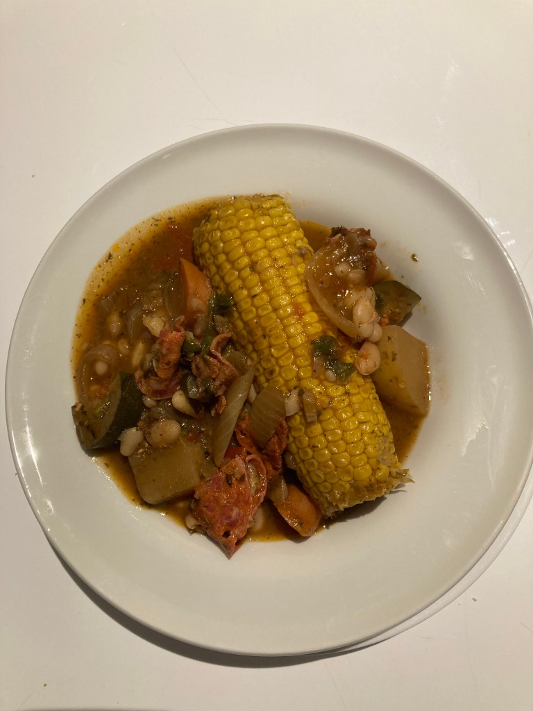 Dinner. Flamboyant Corn. All of yesterday’s concoction plus more chorizo, herbs, beans….and corn cobs. With an Arco del Sol, Ribera del Duero Roble Tempranillo 2023.