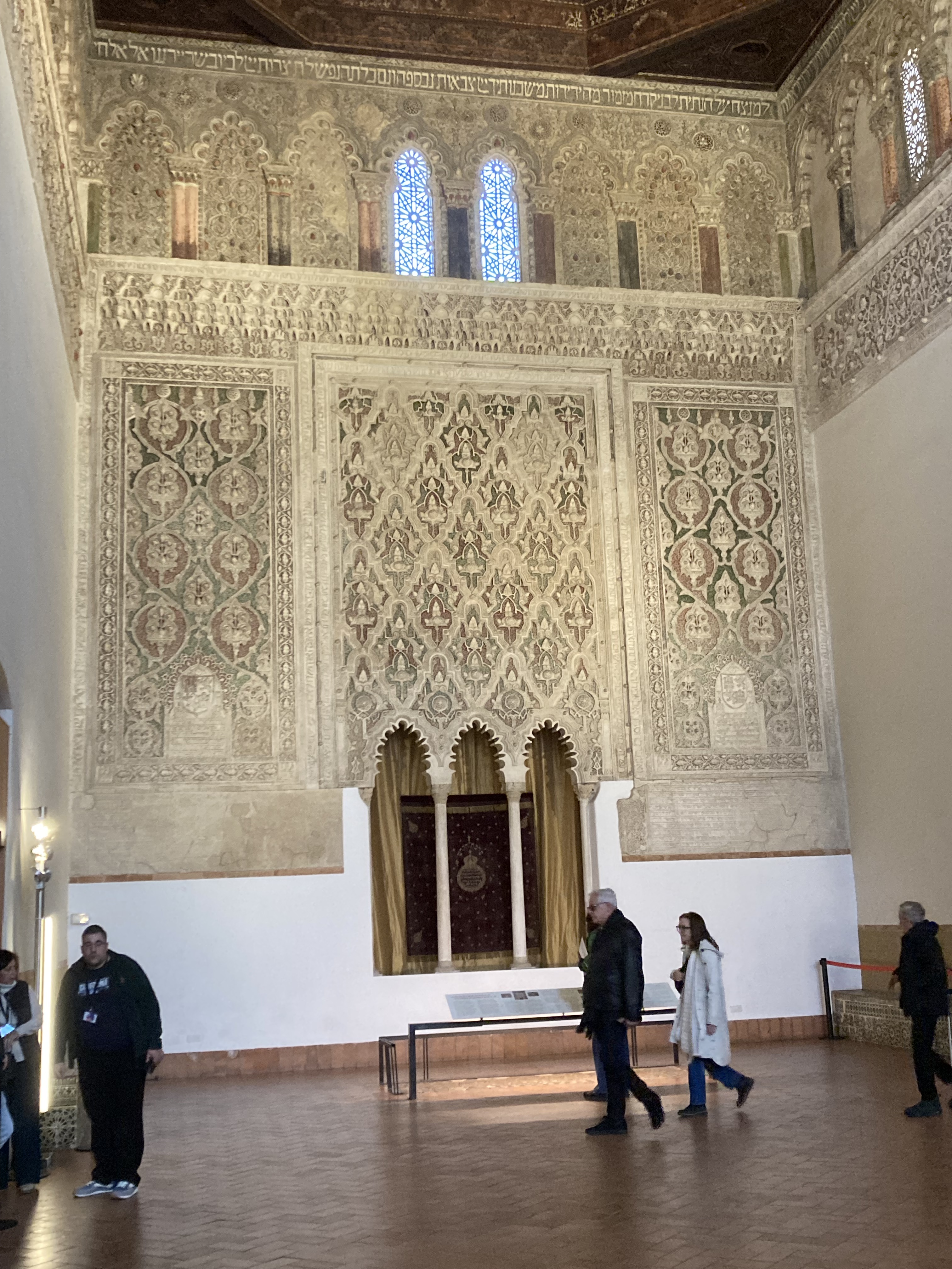 Next stop was the Sinagoga Santa Maria la Blanca, a building that had several ‘owners’ over the centuries and the only building that had significant security, and a screening in place.We learned later that the security has been installed only in recent months (and fortunately there have been no incidents). This was the main synagogue in Toledo’s Jewish quarter, dating from the late 12th century. It ceased being a synagogue in the 15th century and was converted into the church of Santa Maria la Blanca. This was the simplest of the buildings we visited. The walls had lovely ceramic tile decorations, with the stucco capitals decorated with intricate swirls, sashes and pine cones, the latter being a symbol of the unity of the people of Israel. The rooms to the side of the main room contained explanations of the history of the Jewish population of Spain, and of the Jewish religion. It was very comprehensive, we needed a whole day to do it justice and take in the story of Jewish Spain.