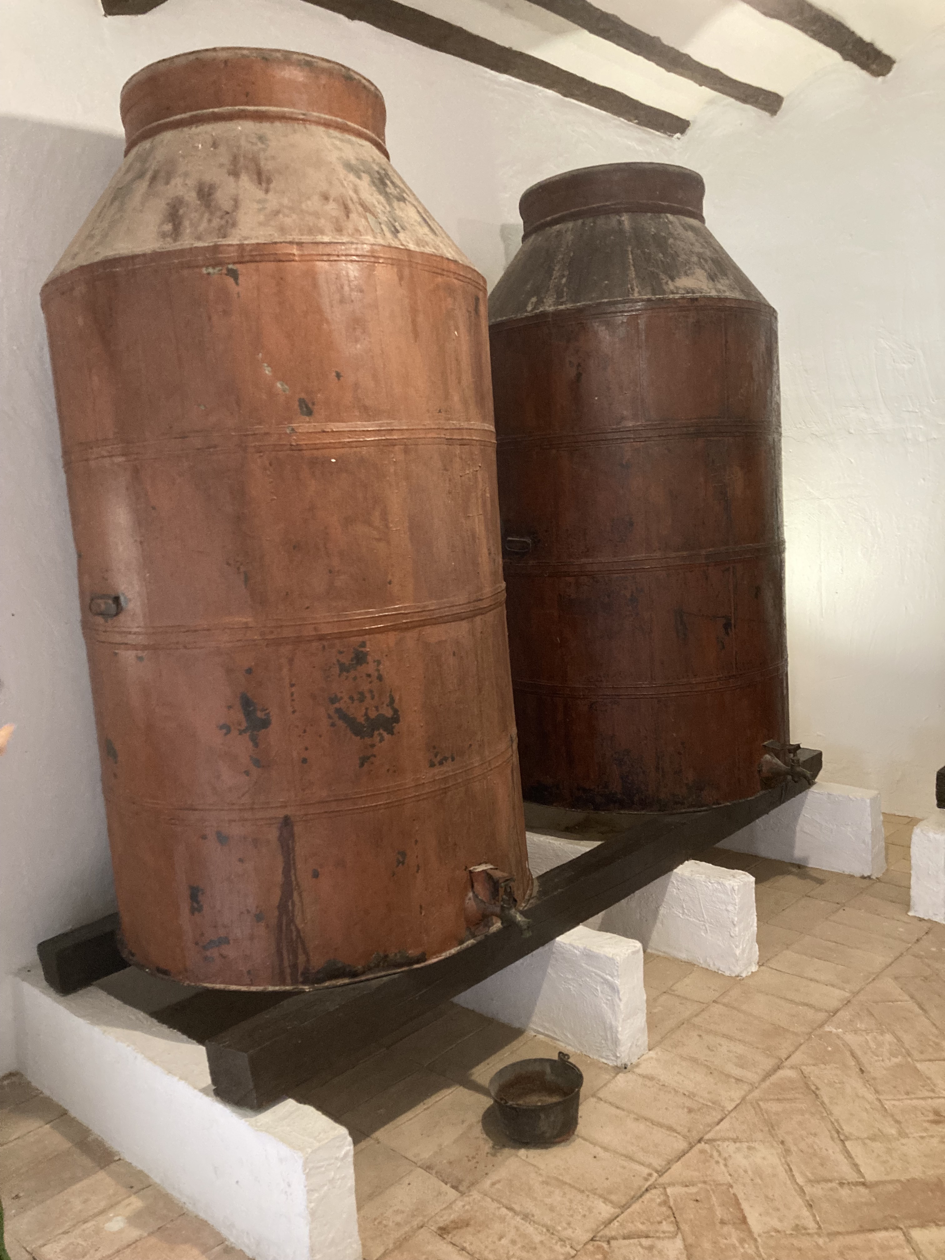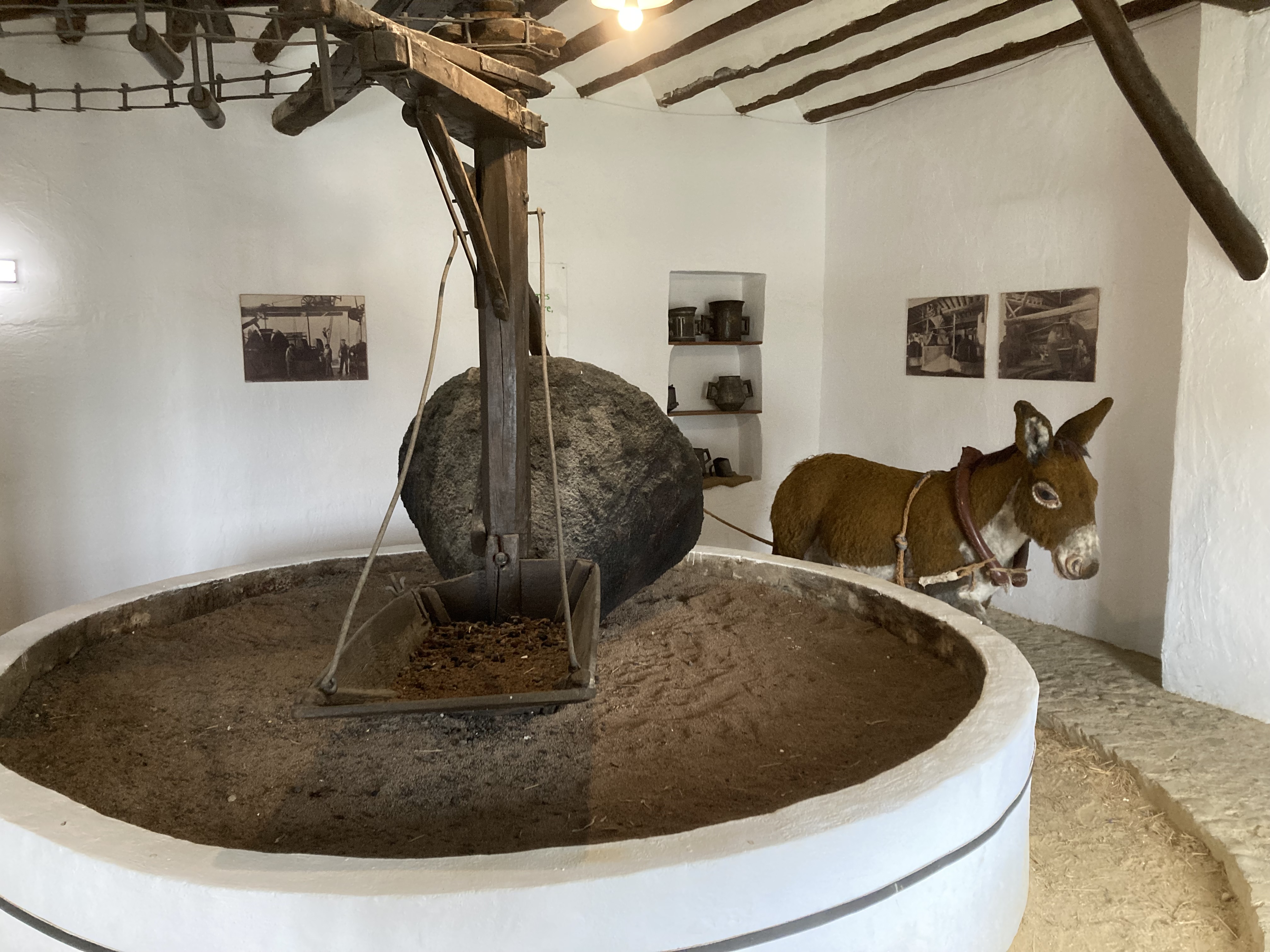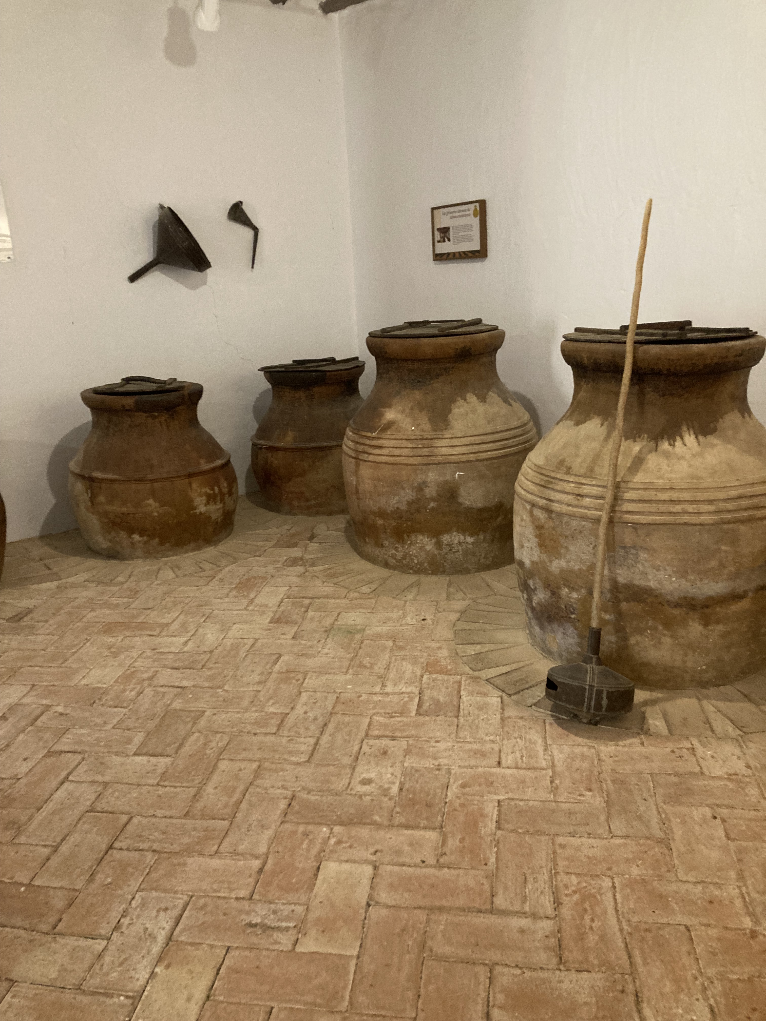 We encountered another delightful and helpful attendant. She sent us off with audio guides, and we were able to wander easily: we were the only visitors apart from another couple, who we didn’t encounter until the end. We discovered that the olives are now harvested mechanically – and processed similarly, with lots of quality control. Interestingly, the way the mechanical devices operate is very similar to the manual processes of the past. Basically it is pick and squeeze, a bit like courtship.