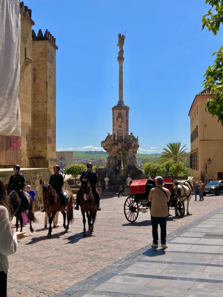 Walked down to the Historico Centro, with first priority getting a coffee. Not so easy, so headed for the Mezquita, where, fortuitously there was a cafe just waiting for us! Shared a table with a gentleman of our age from Ireland, and a young couple from Turkey, and had some lovely chats. The gent from Ireland was an American draft dodger from the Vietnam War, and had, eventually, become an Irish citizen (D didn’t admit to his career). He became an artichoke farmer (Irish mists perfect for artichokes…T has been wondering about buying/cooking) and an environmental writer.