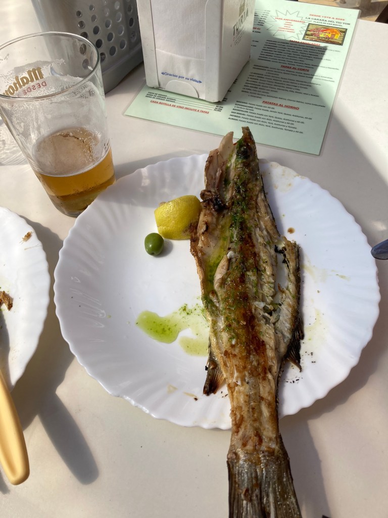 How about a waterfront picnic?… but in passing a little restaurant, T spotted some customers with grilled octopus. However, that choice or calamari wasn’t available for some reason, possibly related to it being well after 3 PM and closing time was imminent, but did have grilled fish (no chips!) with a couple of non-alcoholic beers.