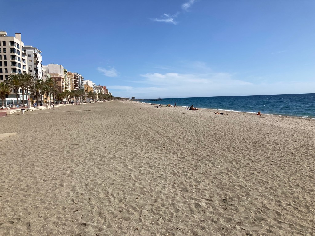 Then a walk onto the beach – very Gold Coast but with coarse grey sand, no wave action & stiff breeze. (Almeria, with an airport, attracts many Brits escaping for winter).
