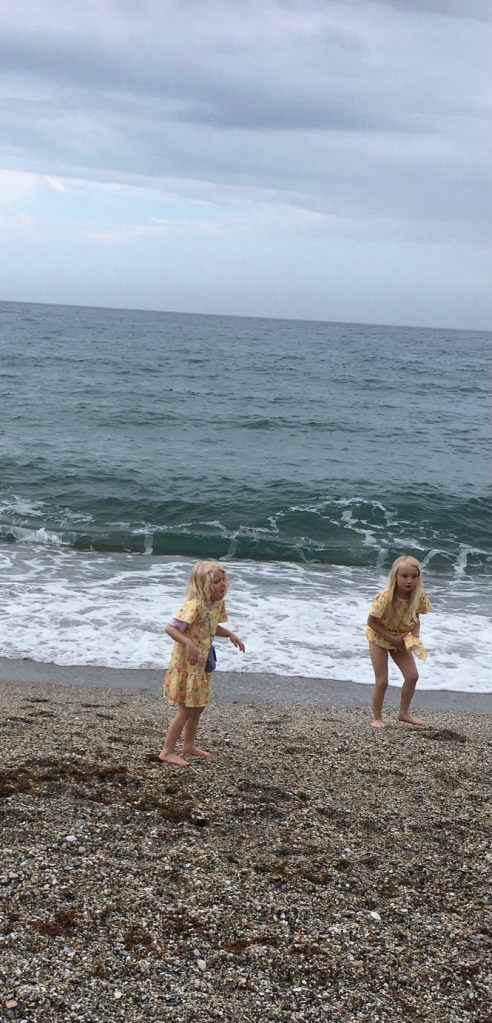 Down to the sea, and a search for a couple of charity shops. A few folk on the beach, and a couple of swimmers. Two little Irish-accent girls enjoyed the paddle – until their dresses got wet and the gravel/sand hurt the feet: mum & dad to the rescue.