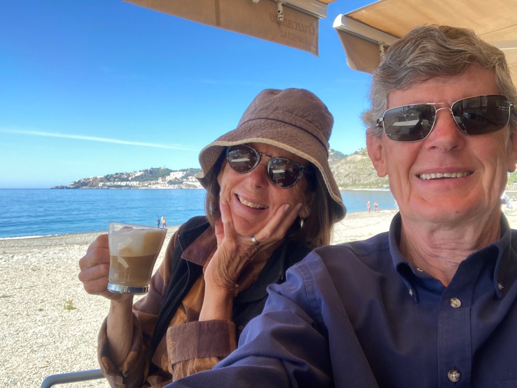 Onto the beach to realize why no one was actually in the water! Colour magnificent, but temperature??? D waded into brass monkey level, and warned T that it was ‘cramp temp’. Yes, it was, but wonderful once the body adjusted. D’s body didn’t really adjust, although he did plunge in at the end so that his manhood wasn’t challenged. For T, the hot stones-bake afterwards was magic.