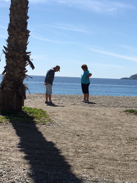 An extempore lunch happened on the wall (bread, cheese, jamon…we must remember to take oil on every outing, as bread, although beautifully crusty, is rather tasteless without oil). The couple playing boule didn’t mind us observing their technique; T thought the senora was pretty good and the senor did all the talking, but there was a ‘tense moment’ about something (this came after an intensive measuring moment in which they used a phone to do the digital measure!)o