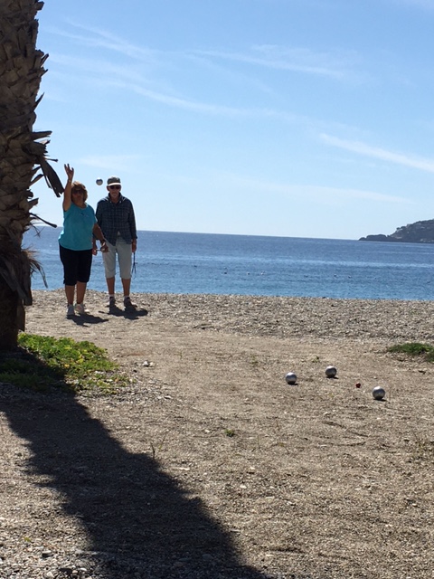 An extempore lunch happened on the wall (bread, cheese, jamon…we must remember to take oil on every outing, as bread, although beautifully crusty, is rather tasteless without oil). The couple playing boule didn’t mind us observing their technique; T thought the senora was pretty good and the senor did all the talking, but there was a ‘tense moment’ about something (this came after an intensive measuring moment in which they used a phone to do the digital measure!)o