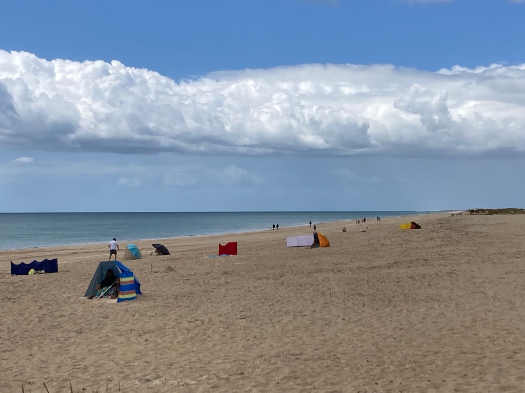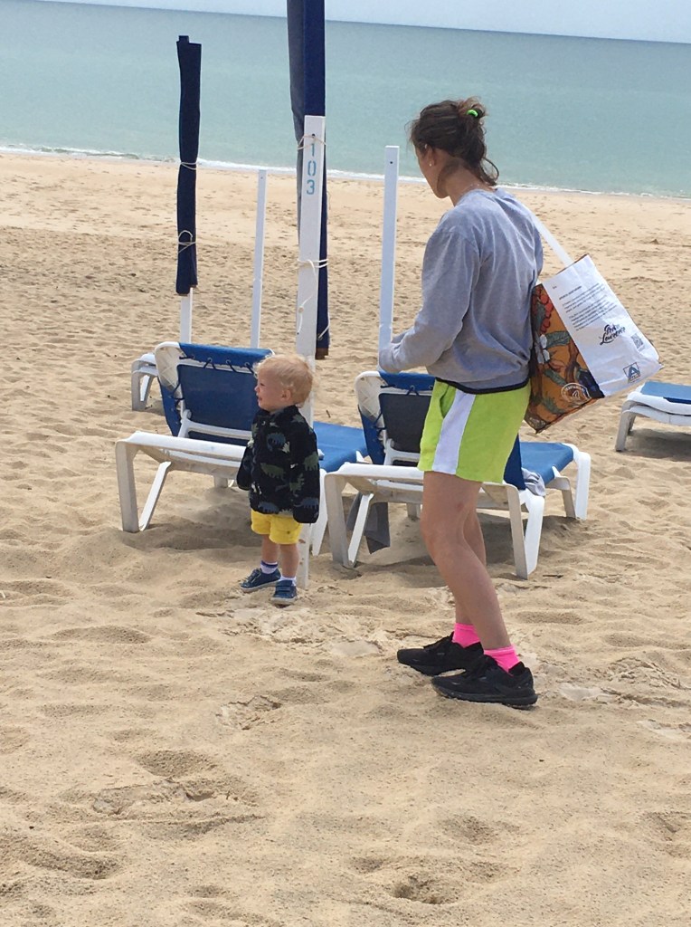 The anchor museum (a graveyard of hundreds perched in the dune, recalling the days of tying down tuna fishing nets) contrasted with the sun lounges. And a little chap was not happy when bucket/spade activity was stopped: rain had started again.