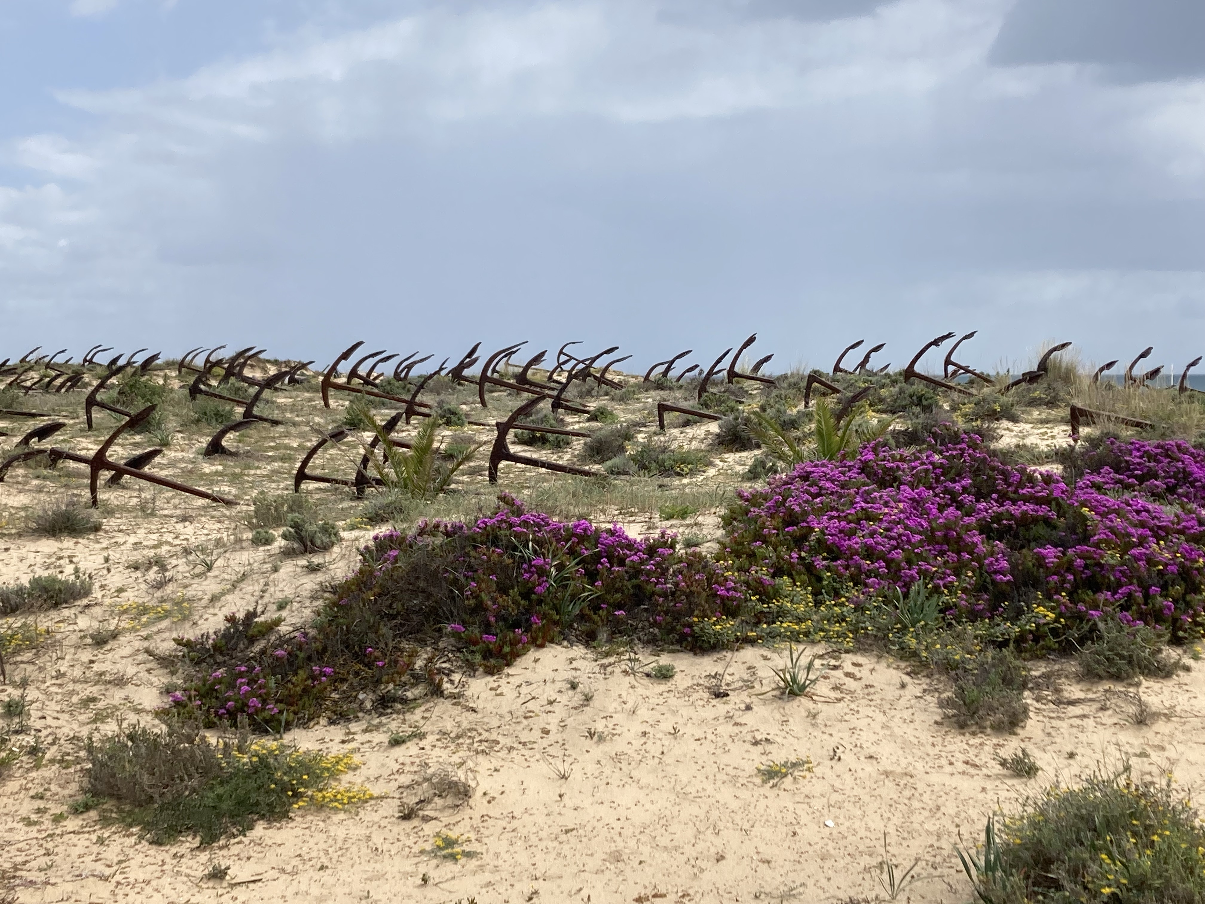 The anchor museum (a graveyard of hundreds perched in the dune, recalling the days of tying down tuna fishing nets) contrasted with the sun lounges. And a little chap was not happy when bucket/spade activity was stopped: rain had started again.