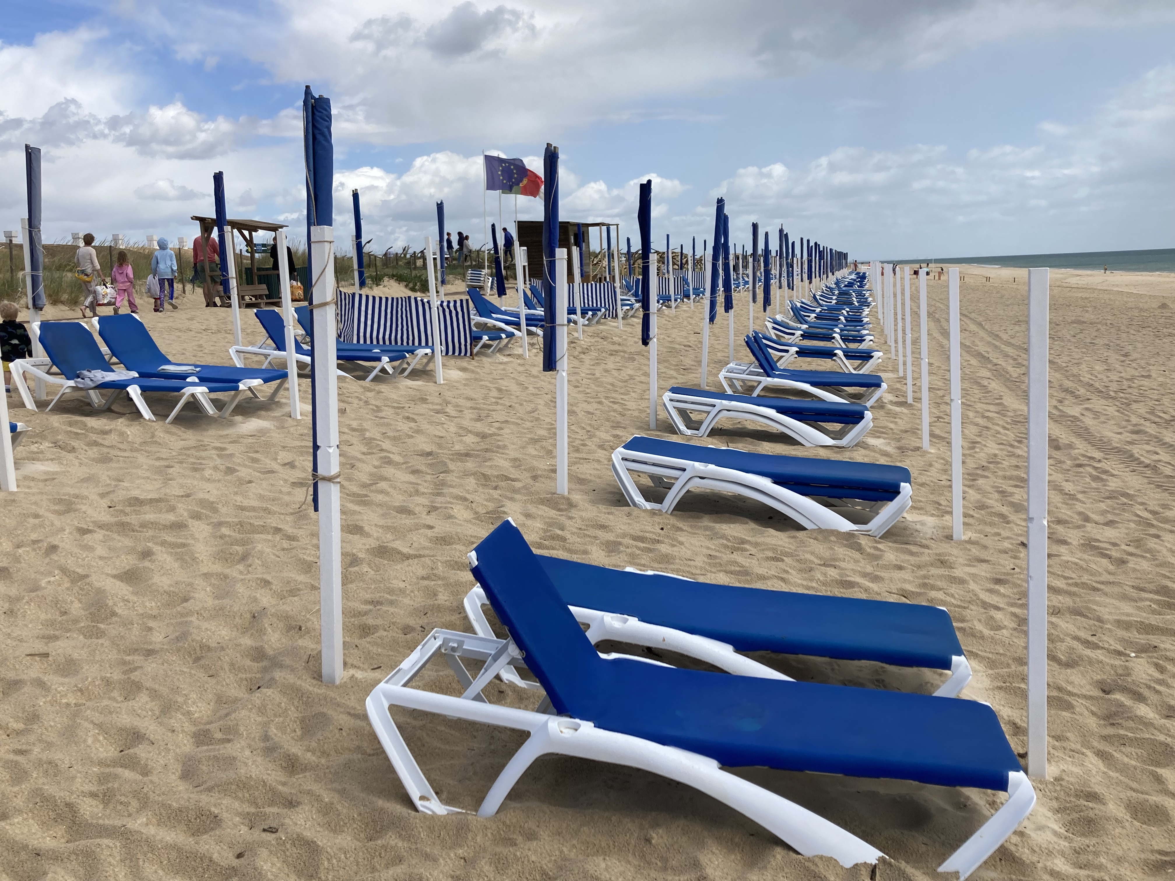 Rain soon cleared, so on to the beach, which faces the Atlantic Ocean. The colours were magic: azure water, grey sky and the rows of empty sun lounges (no income from those today!)