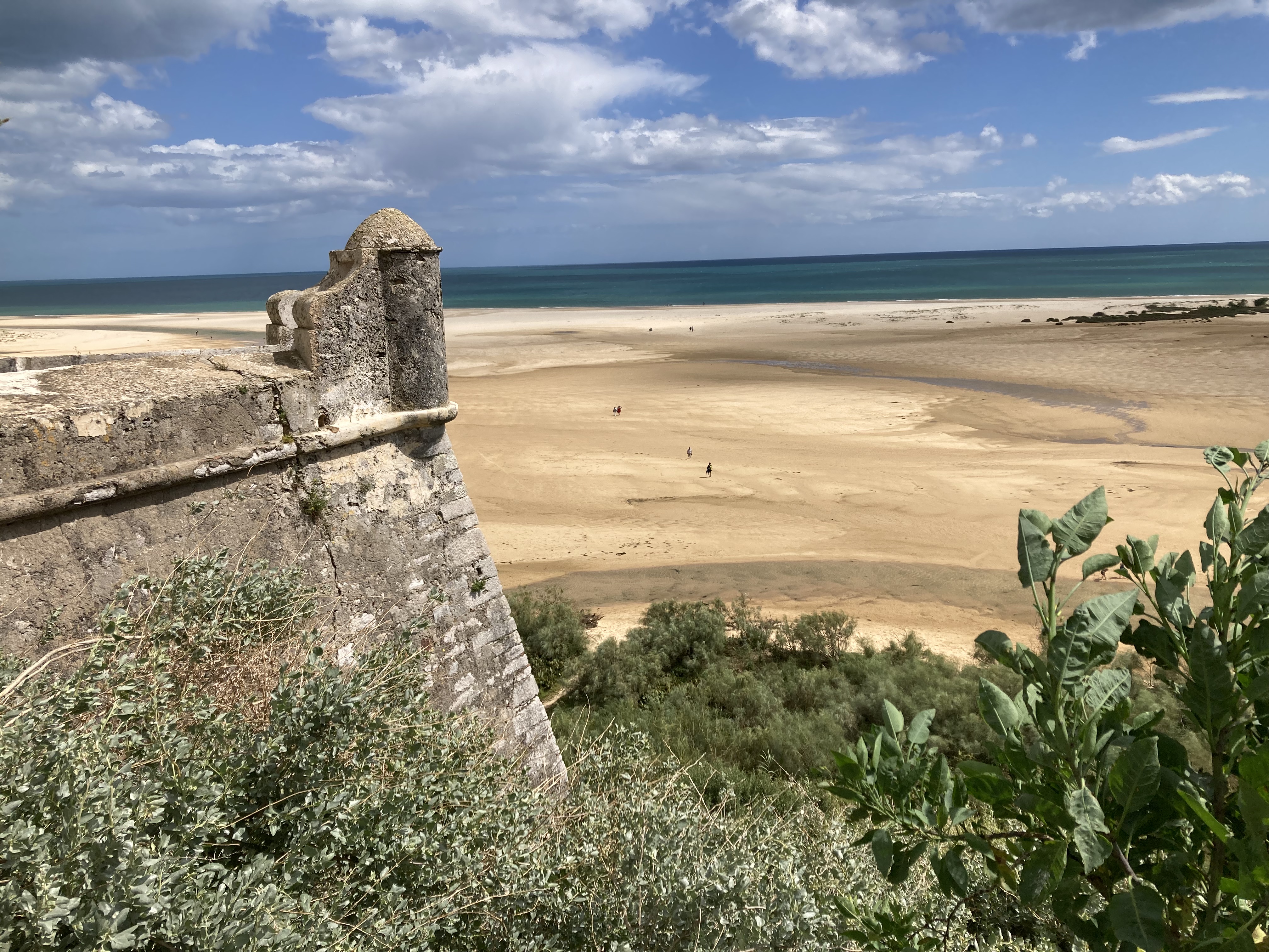 Cacela Velha, about 15 km north east of Tavira, on the Tavira Canal was next: a small former Moorish village, now not much more than a few eateries/bars catering for tourists, plus the tourist accommodation, the industry that has replaced fishing & farming. This leaves whole villages empty except for ‘the season’. T wonders at the effects of this. But the views out over the beach flats were marvellous. Stepped into Ingreja de Cacela Velha, a modest church, and fortuitously exited just before a funeral moved in.