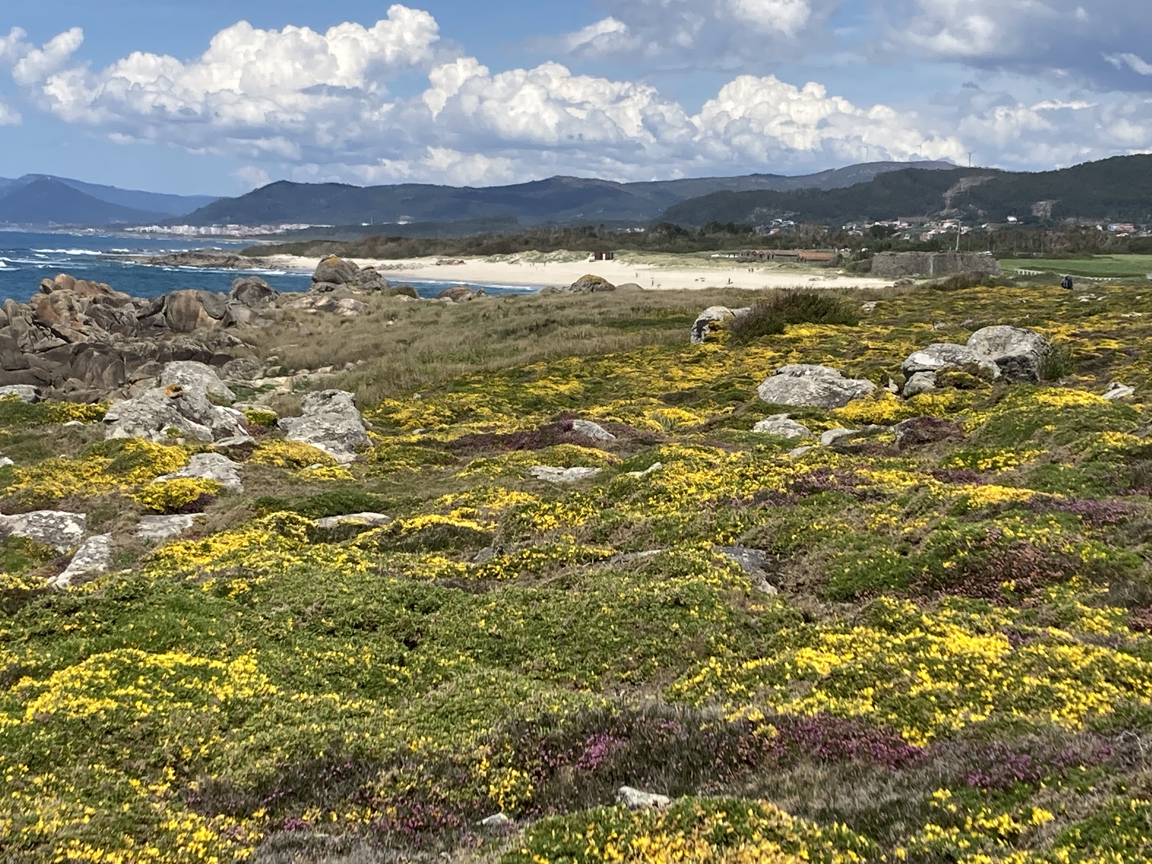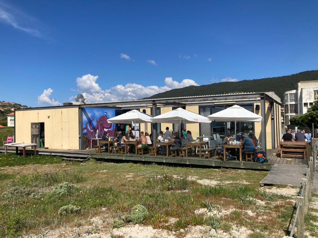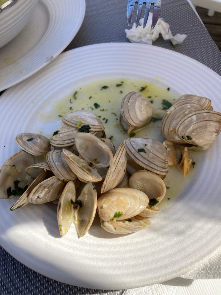 On the return leg of our Camino we noticed some folk enjoying lunch and a drink at a modest beachside restaurant, so decided ‘why not?’ (D was hoping for a bowl of chips).Ordered beers and a serving of the clams to share ( he’d seen or imagined some customers with clams and chips). Ours came with bread, but all was delicious & Camino travelers also called in. So engrossed forgot to take a before photo, so this is after