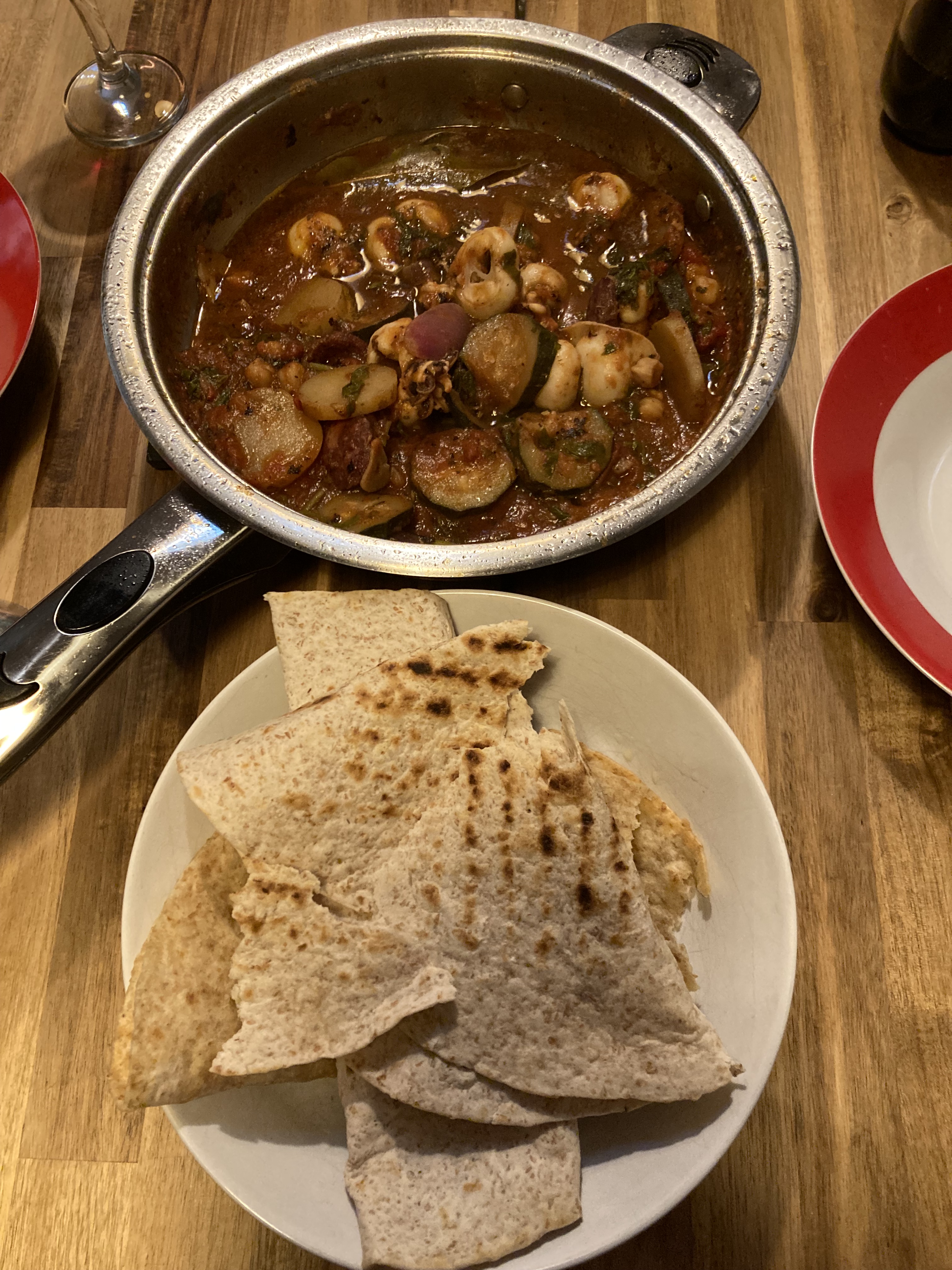 Dinner. Adapted, Authentic Portuguese calamari stew: calamari, chorizo corrente de vinho, onion, garlic, tomatoes, potatoes, red wine, herbs and spices.