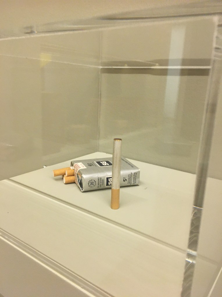 D had, while wizzing through, viewed a couple of other exhibitions, neither of which really captured his interest. Except one, that appealed to his lash up instincts and the uses of a piece of string.T loved the little installation of ‘a pack of cigarettes’, with a single one standing outside the pack. This single one was in fact gold moulded into shape/size of the real ones and painted to look the same. The artist had used his exhibition funding (his entry to a significant European art festival) to buy a piece of gold, make the fake and, being a serious smoker, carried it constantly throughout the exhibition within his routine packet.And the condition of his entry was that his exhibit remain anonymous.Thus, his piece of art was always on display, ‘invisible in plain sight’…(a bit of Banksy spirit?)