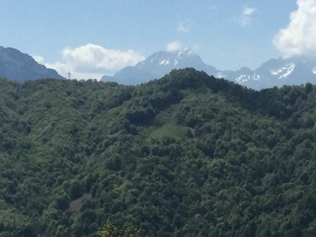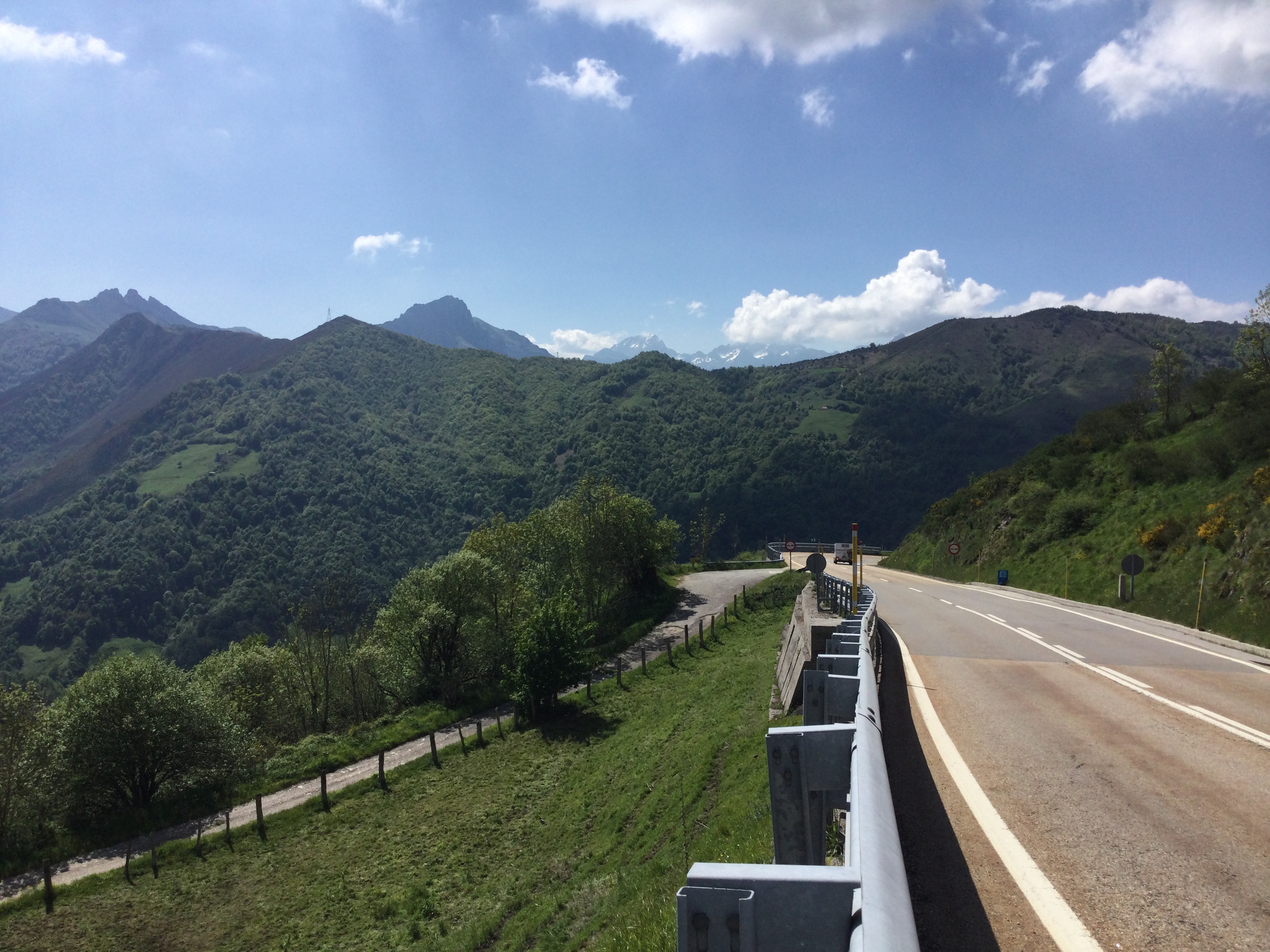 Soon after lunch we were in the Asturias and what a sight! Jagged grey mountains of rock, some still with snowy tips and then the road wound down and down. It’s now green all around, with the Coste Verde an arm’s length away. And once again, the cameras on our little devices can’t do the scenery justice.