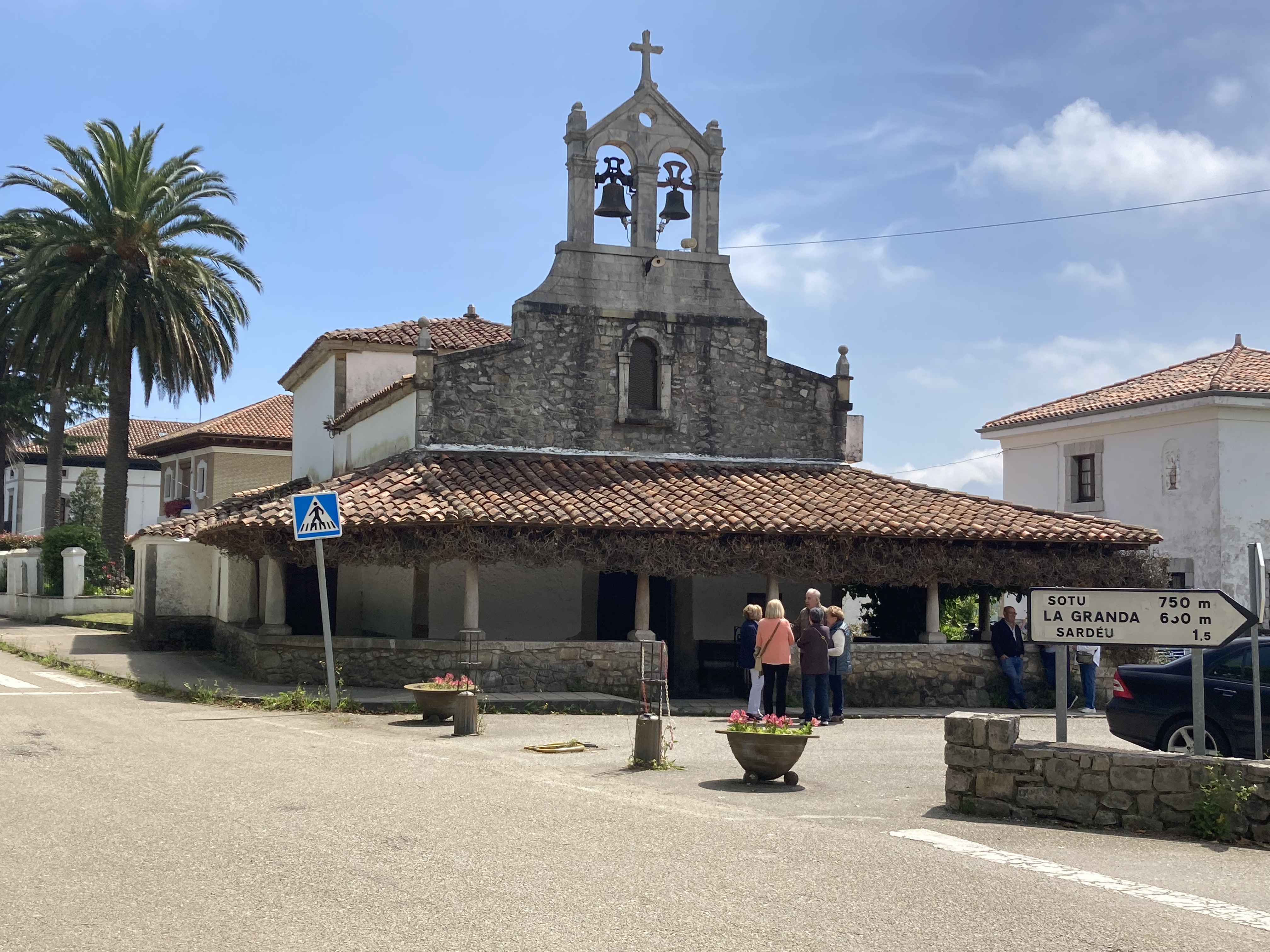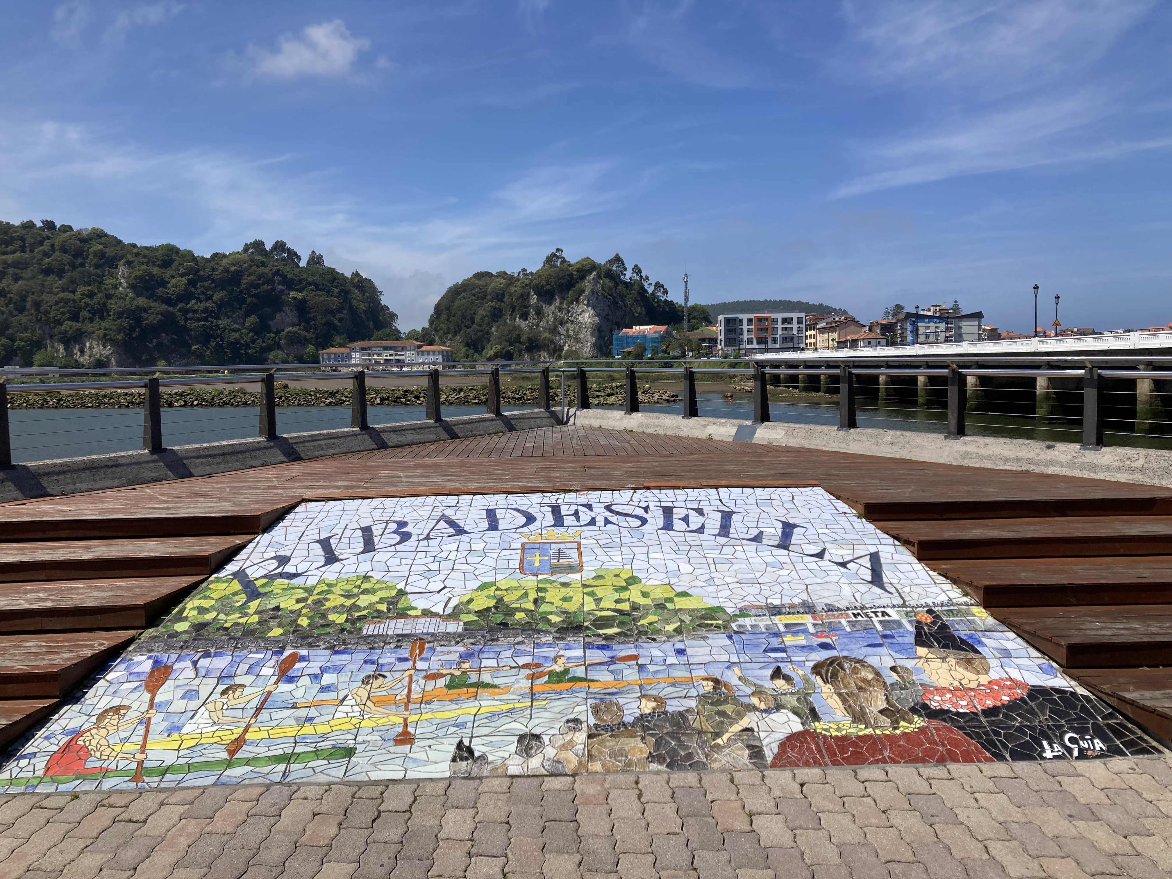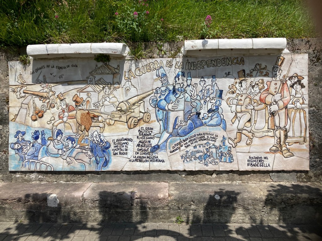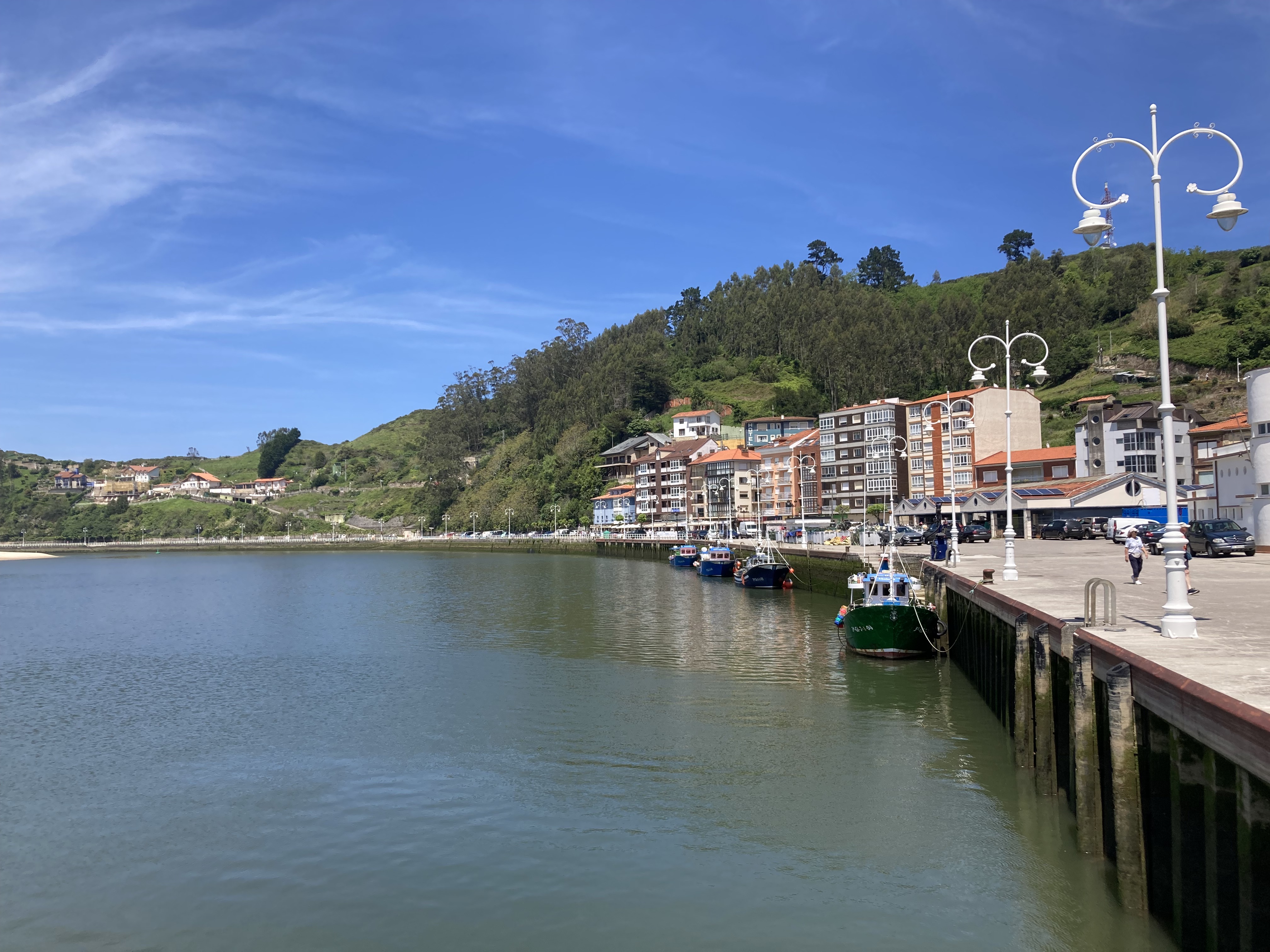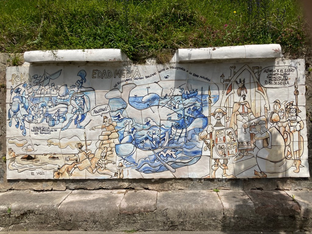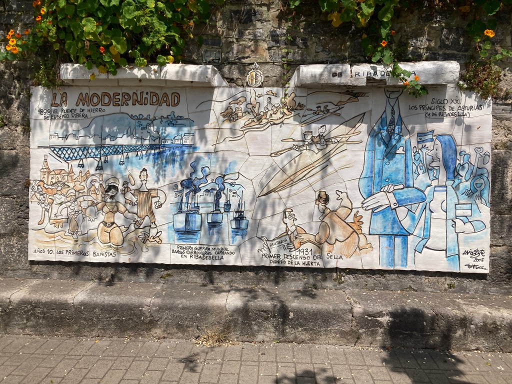 After coffee, a 4km drive into Ribadestella, a picturesque town on the mouth of the Rio Stella. Walked along the river side, with the cafes, restaurants and bars already humming and a few kayakers in the bay. A couple of SUP riders were later seen struggling to paddle their way back into the river: both eventually got safely onto the river sandbank. There were fishermen along the walkway, and across the river on the sand.