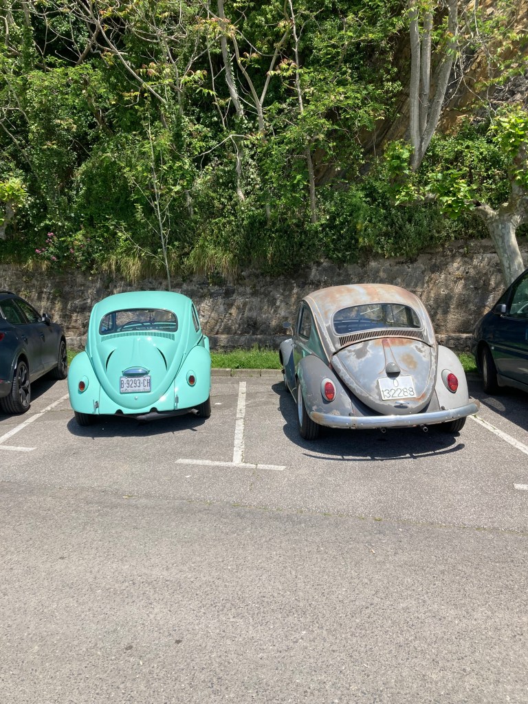A modest day to recover from the long time in the car yesterday. After chores, a short walk into El Carmen, our local village, to check out both the other access route – we’d been advised that the one we came in on may well be closed off – and to find out what was going on. There had been loud explosions last night from that direction that D had thought were shotgun reports, or possibly scare guns. This morning there were more, much louder, and a piece of debris (a meter long piece of narrow doweling) fell into our backyard! Monica informed us, after D asked if WW3 had started, that it was noise to attract people. As we walked, more fireworks, and we could see smoke trails before the explosions. Turned out it was the annual fair, the Féria de S. Isidro, a fairly contained event, and our access was indeed blocked off to contain some cows. The good news was that the alternate access was fine, albeit a little bit harder to navigate. Several backyard horreos caught our interest. They are traditional backyard raised storage huts for animal feed/grain/ vegetables, keeping moisture and rodents at bay. And one structure, clearly based on a horreo, was clearly being built as a residence with steps and planter boxes – T thought of a ‘granny flat’, but perhaps (probably) it’s going to be an ‘authentic’ tourist accommodation