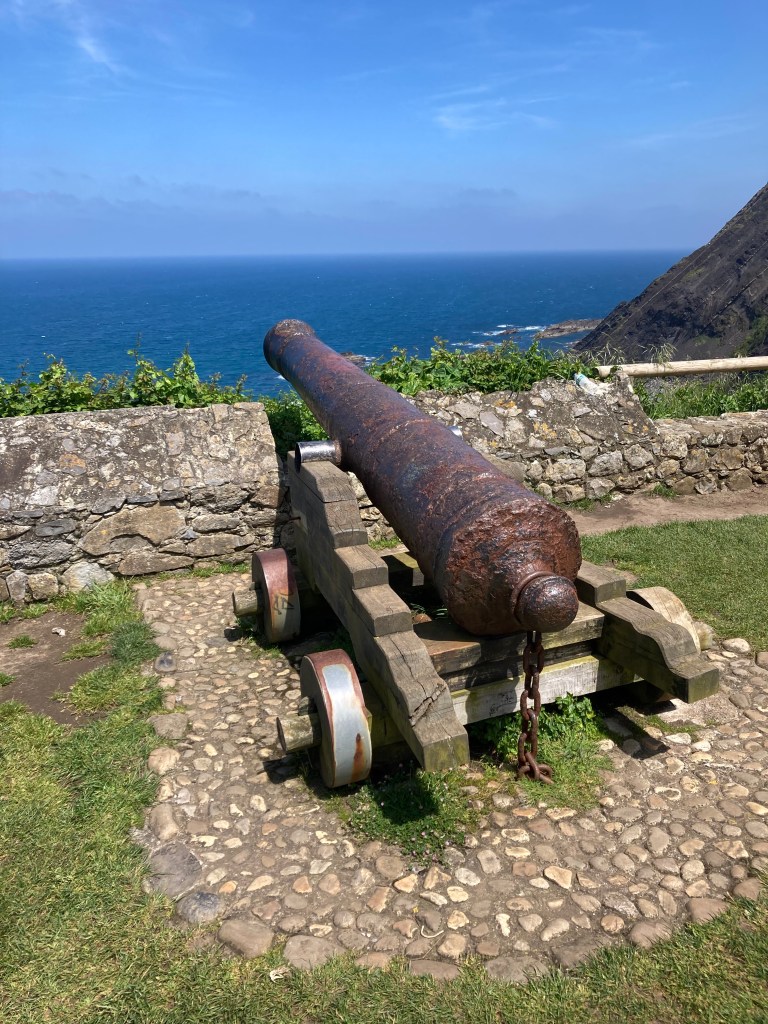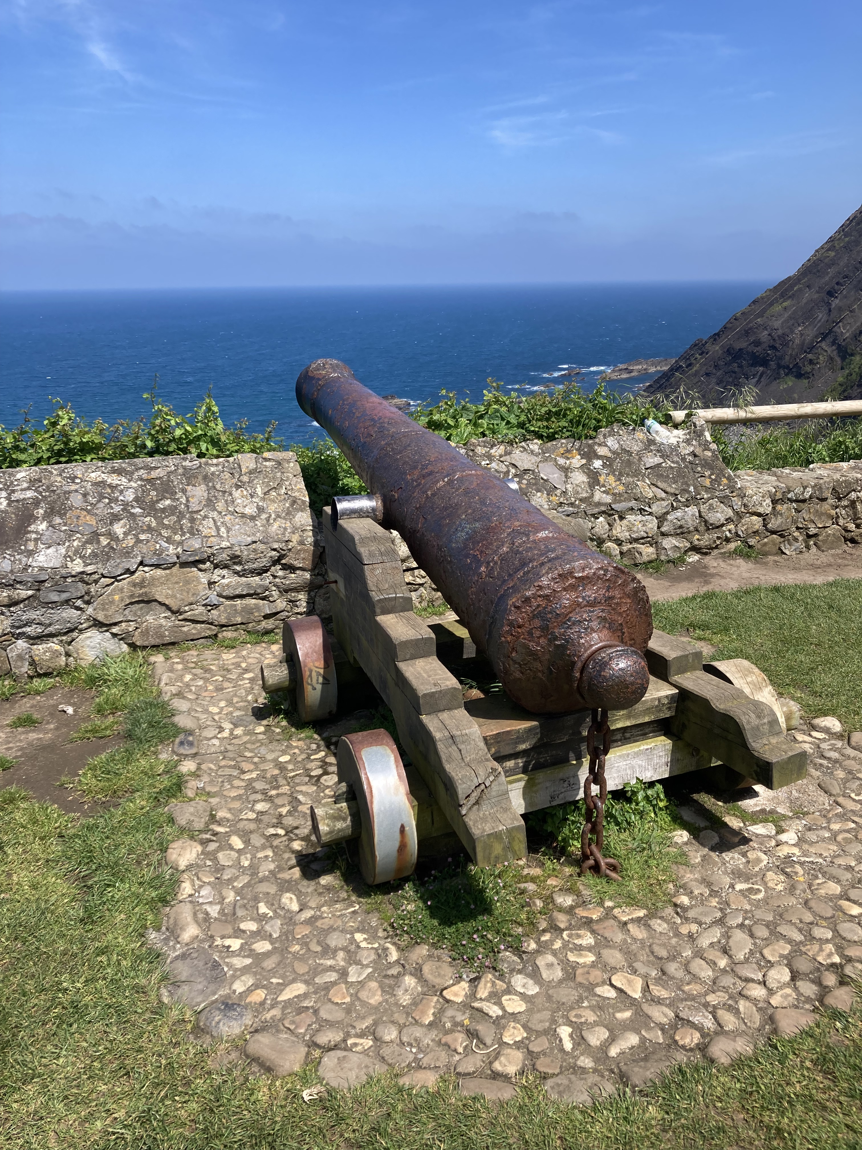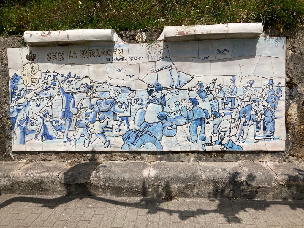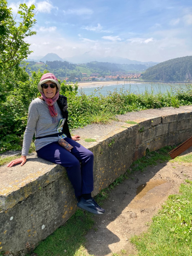 Decided to take the stairs to the Ermita de la Giua, a small capella on the headland overlooking the river mouth and out to the Cantabrian Sea, which gives way to the Bay of Biscay, which gives way to the endless North Atlantic Ocean, as far as we could determine from the untrustworthy Doris. The chapel is dedicated to the Virgin of Guía, patron saint of sailors. Tough gig. D obligingly took some photos of two couples, both of whom didn’t pay the two euros he demanded: perhaps they thought he was joking? One of the couple engaged us for a while. They are from Argentina, and the lady had good English, so translated back and forth to her man. Lovely exchange. The cliff faces demonstrated the geological impacts over millions of years, another reminder that nature will take its course.