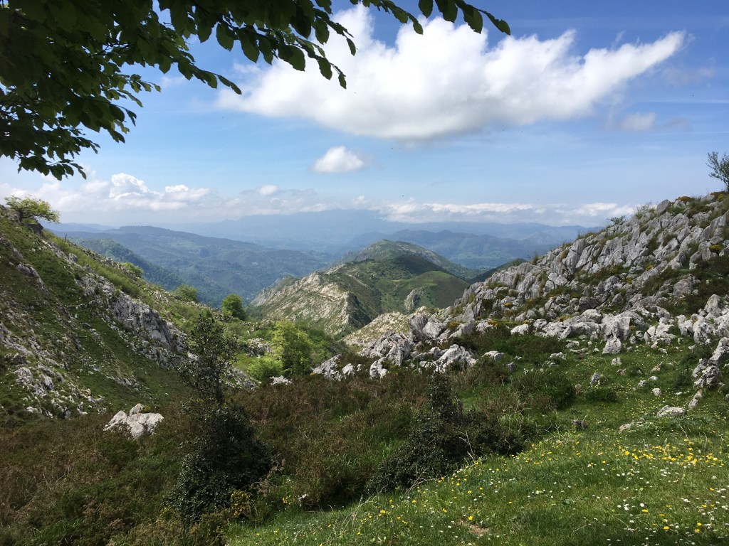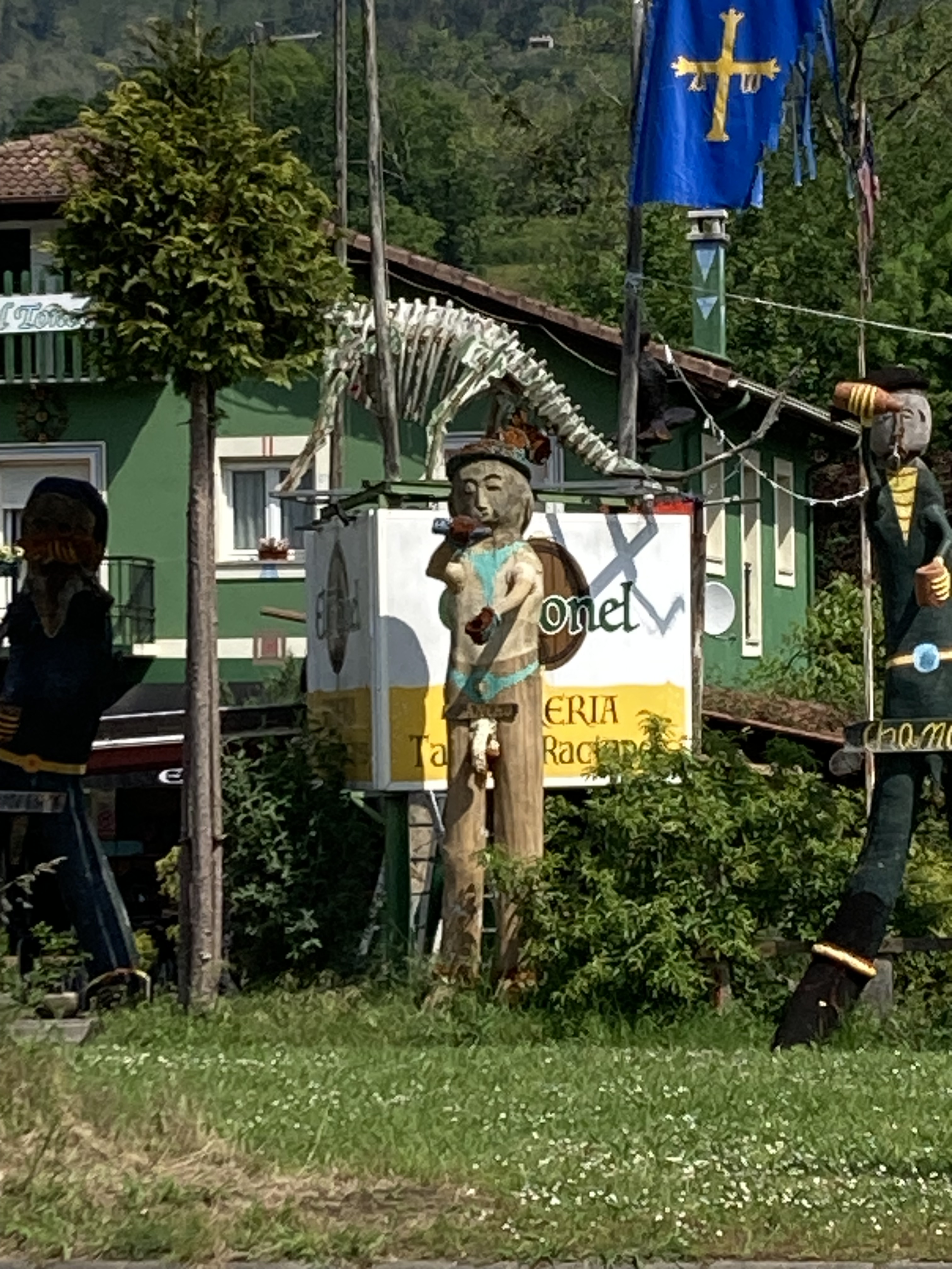 The Santa Cueva de Covadonga (Holy Cave of Covadonga) is now a Catholic sanctuary. A spring flows out of the cave and below this there is a fountain with seven spouts. On the altar, a gold panel represents the battle of Covadonga, that defeated the musselmen (Muslims) in 711. The Asturian hero Pelagius is buried in the cave. He was a nobleman who founded the Kingdom of Asturias in 718 and is credited with initiating the Reconquista, the Christian reconquest of the Iberian Peninsula from the Moors, and establishing the Asturian monarchy, making him the forefather of all the future Iberian monarchies. Legend has it that a vision of the Virgin Mary gave the Asturians strength. It’s all part of the legend, whose origins are disputed. Before leaving the cave we paused to sit and contemplate; a big bunch of teenage school kids had preceded us (T wondered what it all meant to them). Then the scrutineer who had repeatedly announced on the PA system that there was to be no photography (but nodded to a couple of folk that it was OK – very Spanish) engaged us in conversation (we didn’t think we were so identifiable as tourists) and gave us a potted history lesson. We are not sure we have really got a handle on the history and the legends: there were a few blind corners and alternative versions/facts/interpretations. What a surprise! A few things stood out: Asturias IS Spain; it has never been conquered (pretty much due to its terrain and despite the fact that the original Asturians came from Northern Europe); the future monarch always comes to Covadonga to take on the title of (we think) Prince or Princess of Asturias (like the Prince of Wales). This explains the grandeur of a rather isolated spot in the mountains and the size of the souvenir shop. Lunch was a forgettable sandwich in the cafetaria.