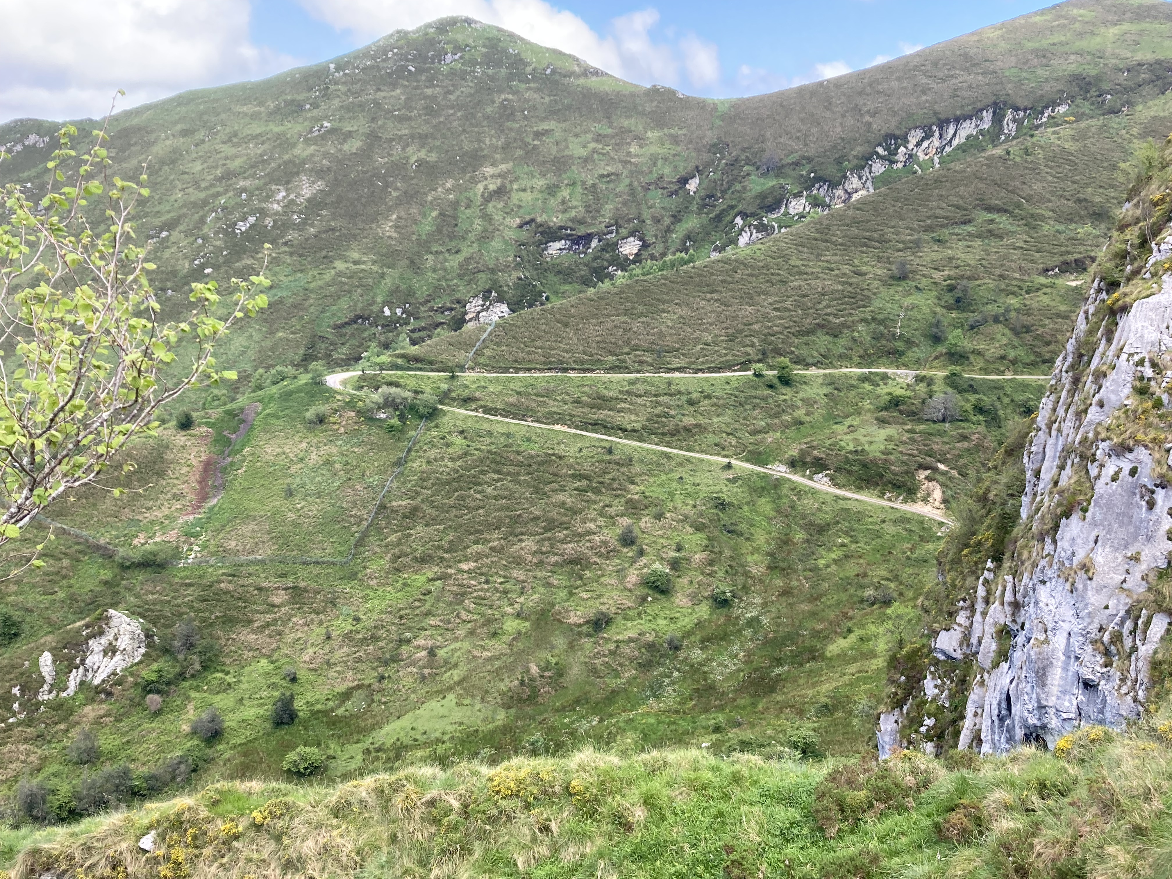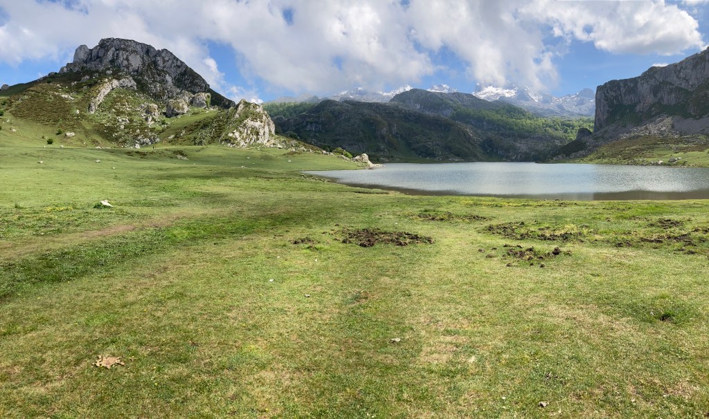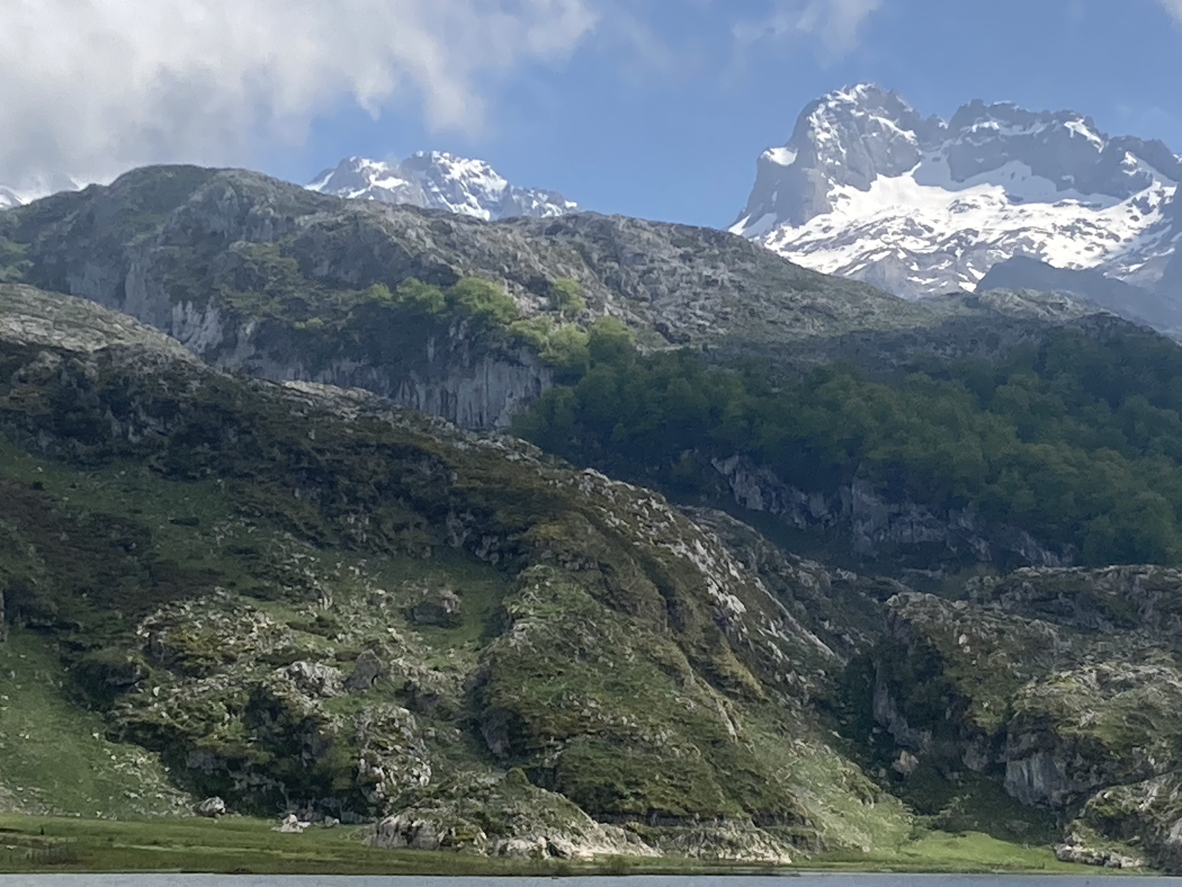 The Lagos de Covadonga (Lakes of Covadonga) are composed of two glacial lakes – Lake Enol and Lake Ercina. They are the original center of the Picos de Europa National Park, created in 1918. Eleven kms of super narrow bitumen (sheer on T’s side!) winds up to the parking lot beside lake…and a stunning backdrop of snowy peaks. We shared the road with a cycling group who had minivans to do the pickup. The ride was indeed very serious but we only saw one participant walking his wheels.