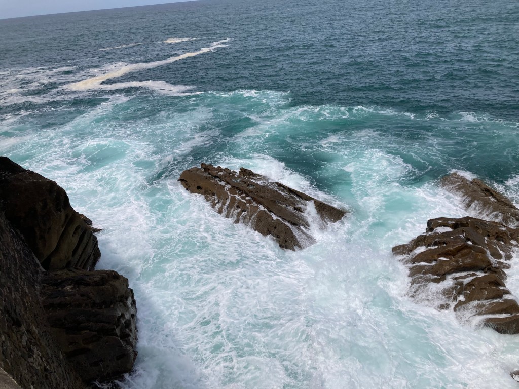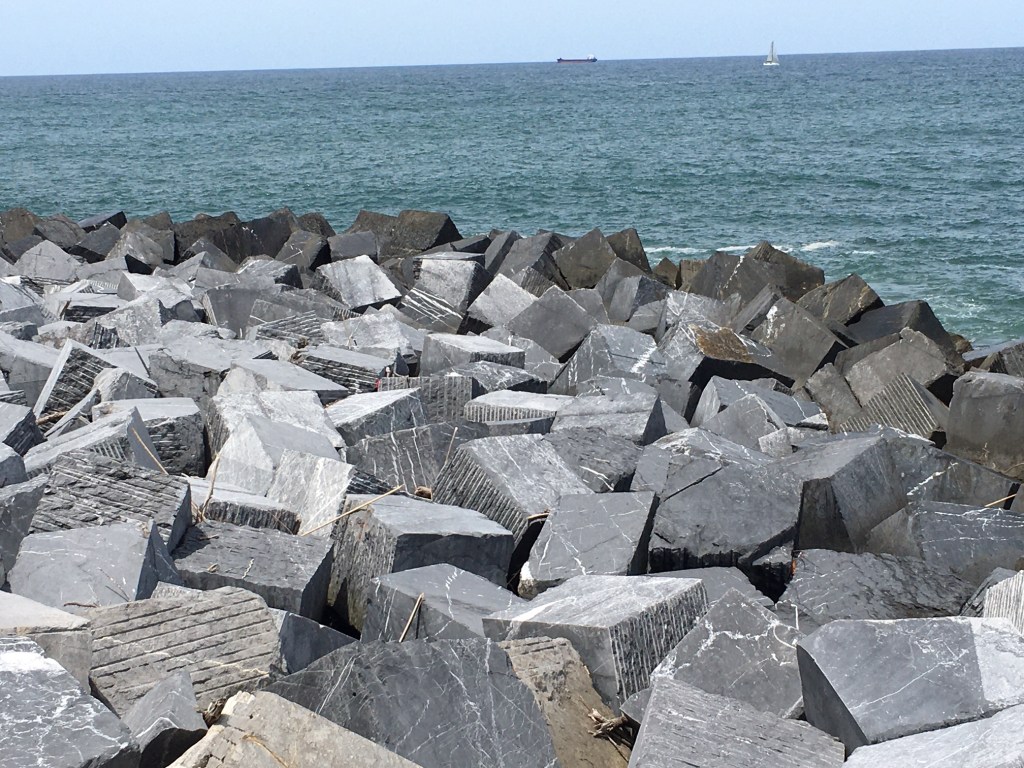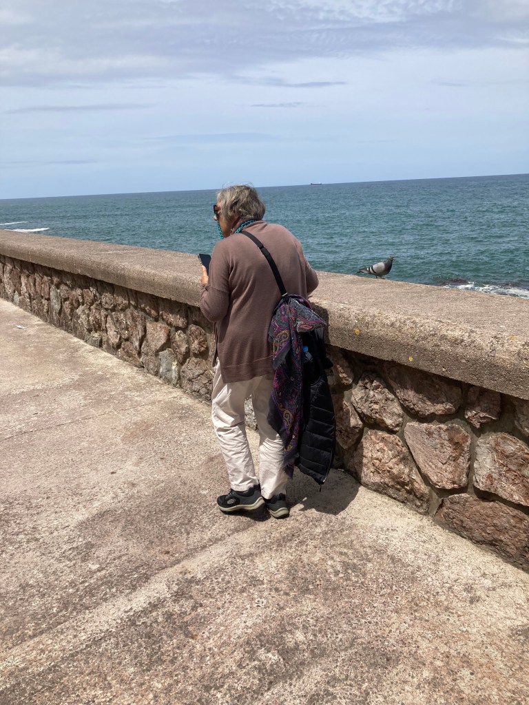 At the Tourist Office, we got maps, a small Basque dictionary (good luck with that) and walking route advice, then set off beside the river mouth, by the old town, around the bluff, and there was the sea, surging onto massive grey blocks of granite (?)