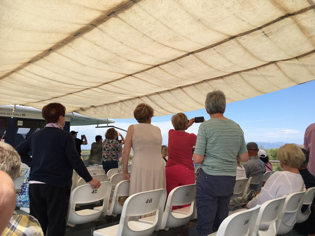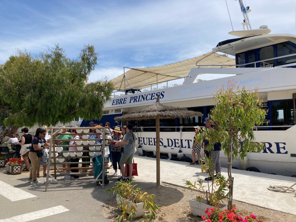 Warm day, so we took our swimming gear just in case. Headed back to Riumar to check out boat trips on the L’Ebre. Stopped in at the swish, new Tourist Information office there: closed, with no hours of business or any other advice. So headed for Port de Deltebre, and we’re greeted by a gaggle of souvenir shops, restaurants and cafes and various sized cruise ships/boats. Fronted a ticket seller for Creuers Delta De L’Ebre, hoping for a small craft, but the minimum was five people: sadly, three others who were looking to do the same had given up and bought tickets on the big boat, departing at 1230. We had one minute to make up our minds, so opted to go with it. It was pretty full and the commentary started in Spanish, followed by German, then back to Spanish. We were with a German tour group! Didn’t we write last night it was great to be in a ‘non-tourist’ zone? Karma.