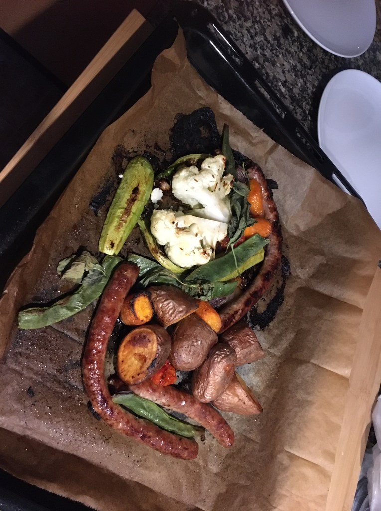 Dinner. Baked traditional sausage (recommended by previous host) and vegetables: potatoes, carrots, cauliflower, onions, tomatoes, flat beans. Current hosts have greeted us with cherries and peaches!