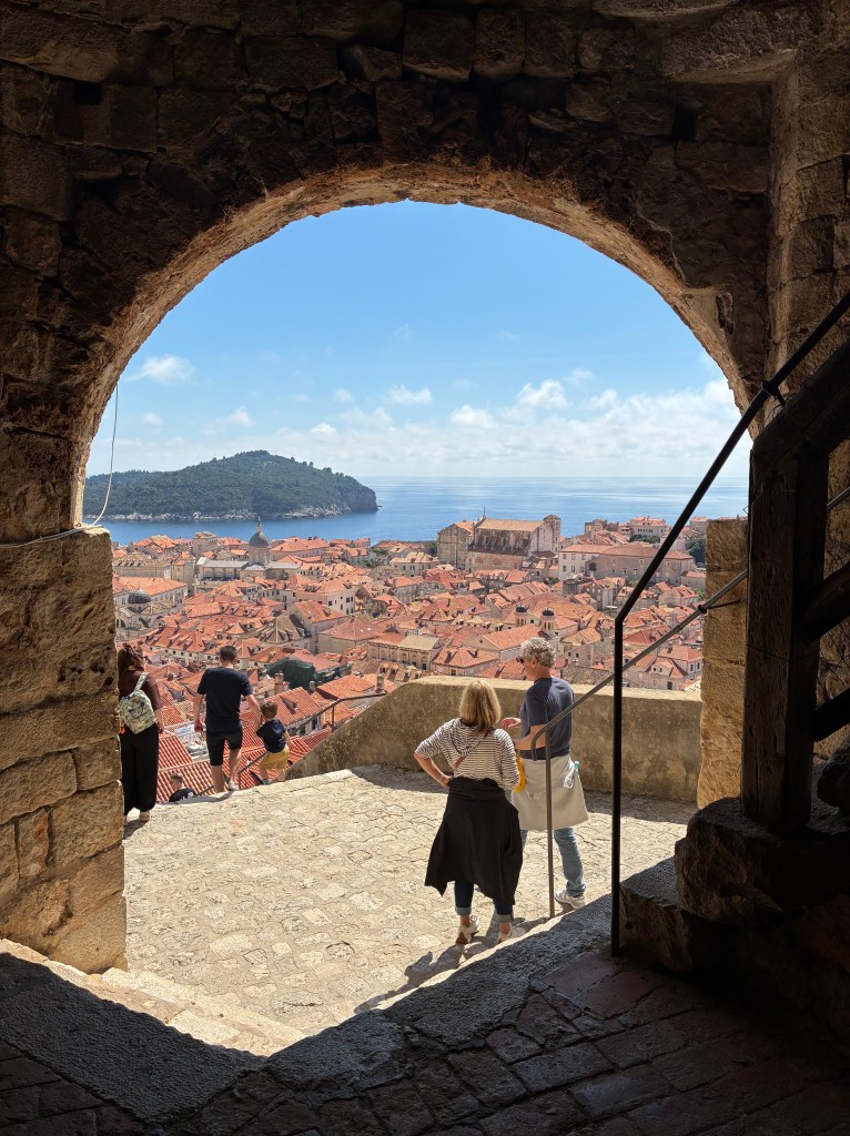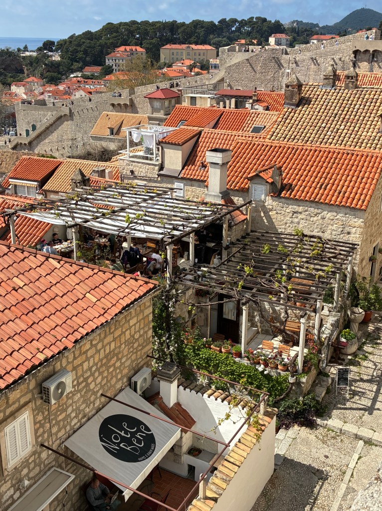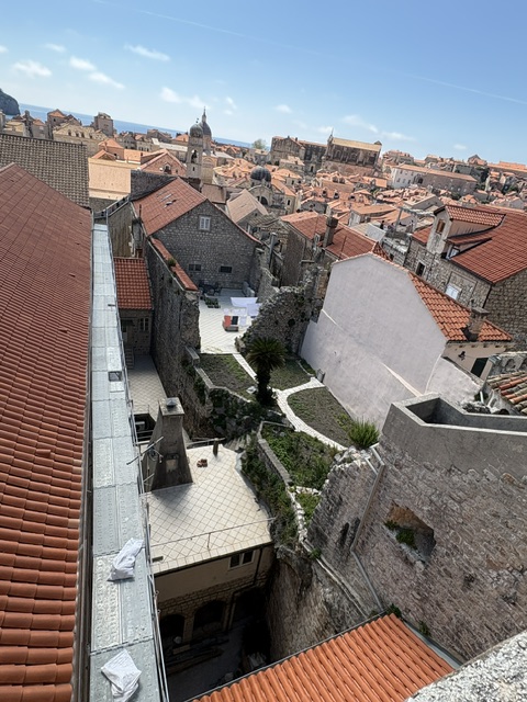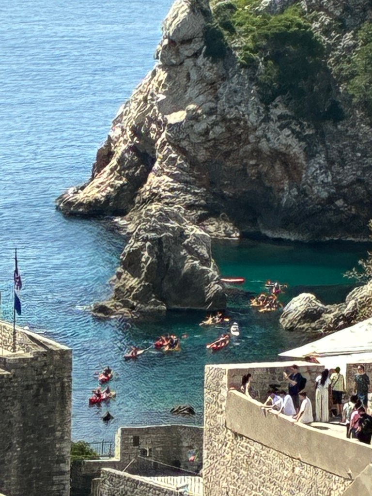 At 40 euros for a once-only, one-way stroll, it takes us much of the day. And it was terrific. Being a one-way circuit reduces congestion & despite whichever cruise ship was in today, there was no real pressure. Views across the rooftops were splendid. It was a perfect day for: roof repairs, peeking into backyard terraces, admiring the vege-patches, watching the kayakers and jetty-jumpers, and drying the undies & socks.