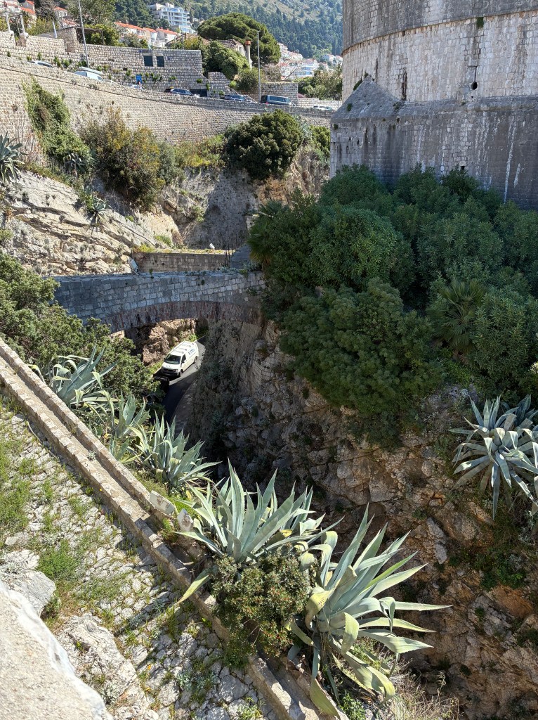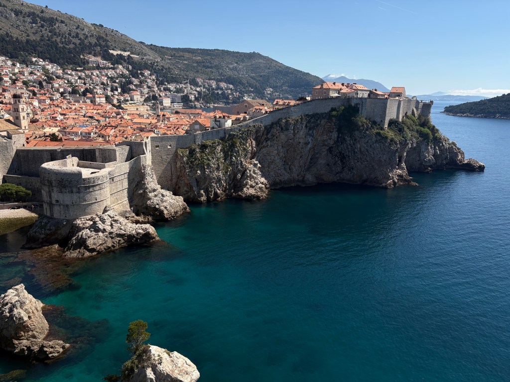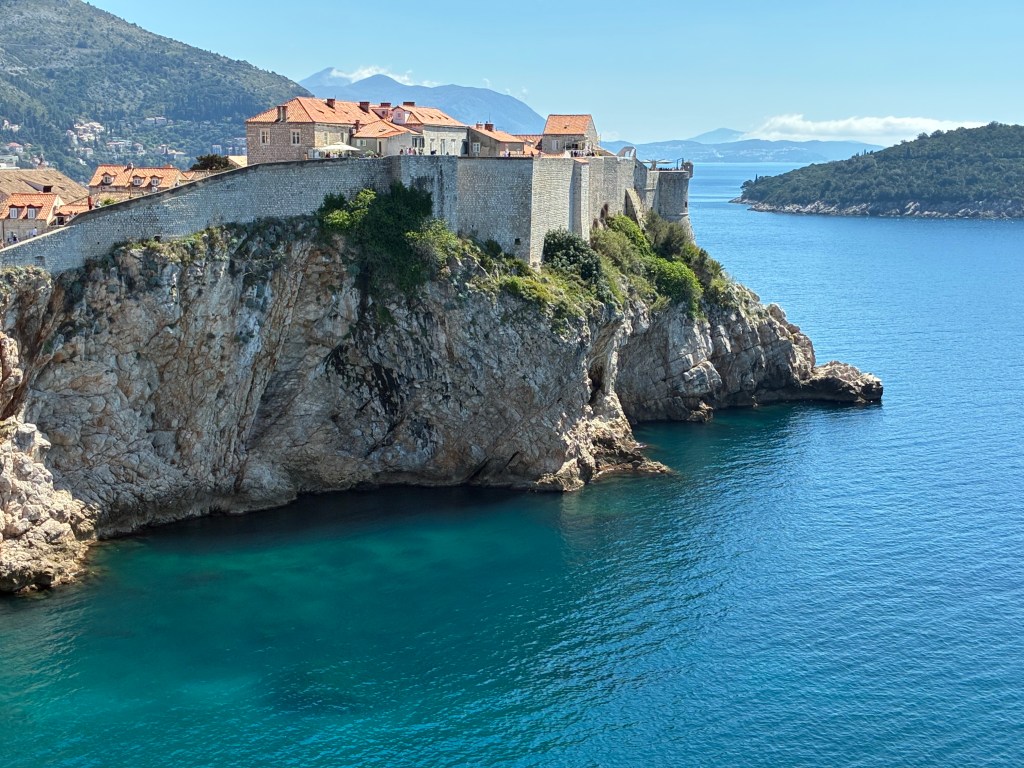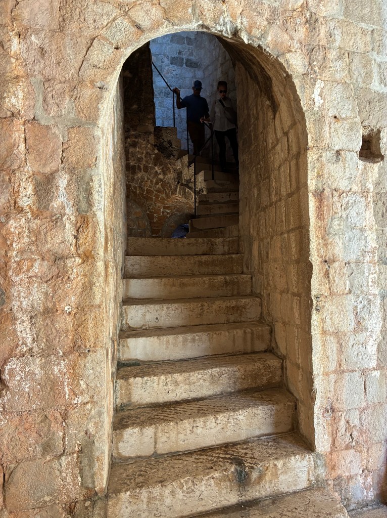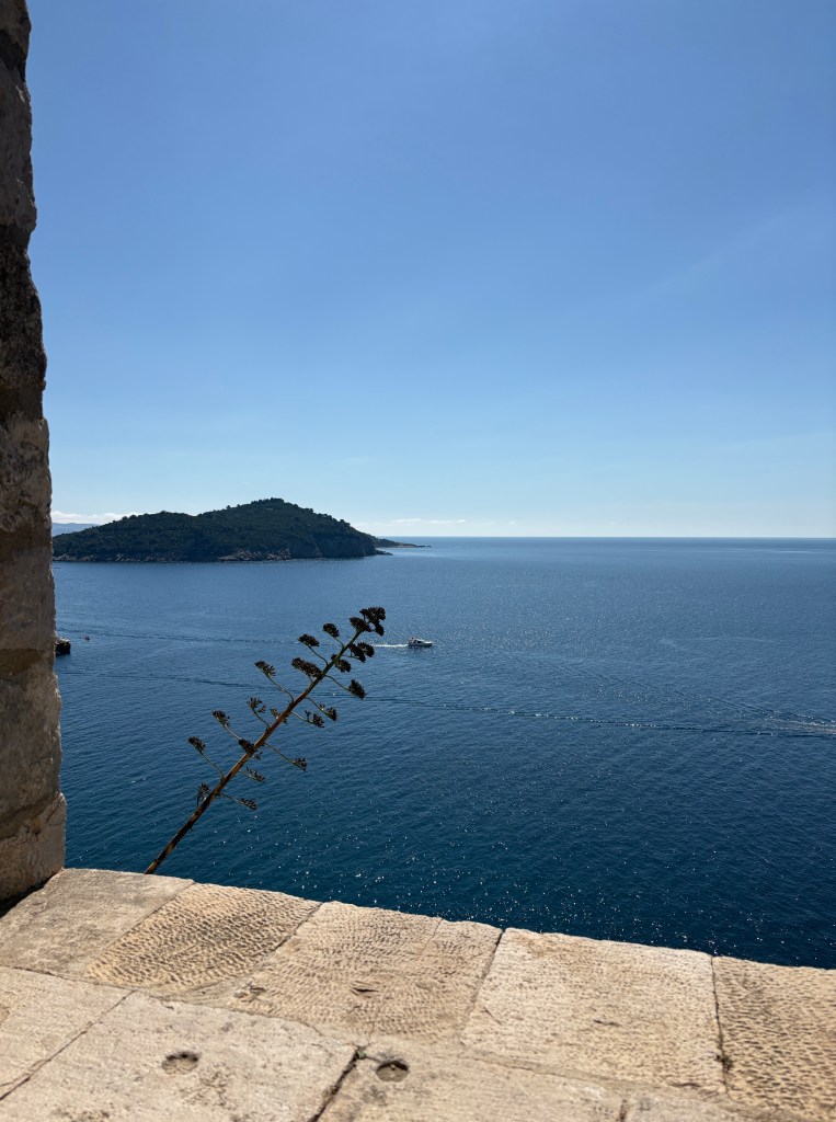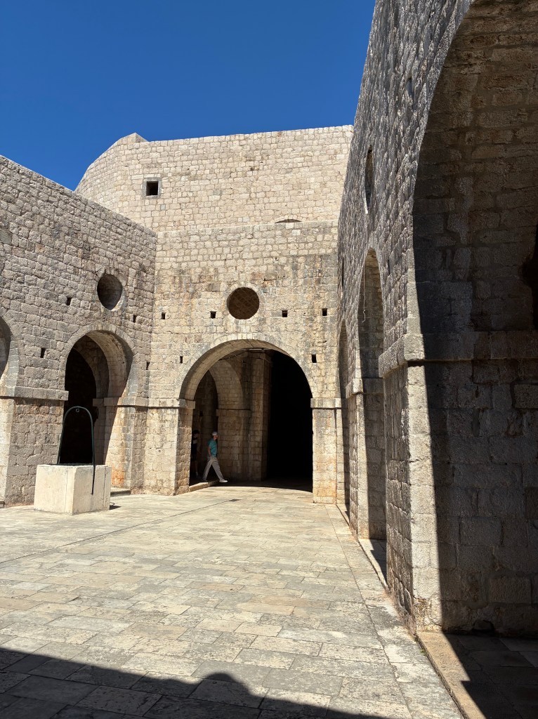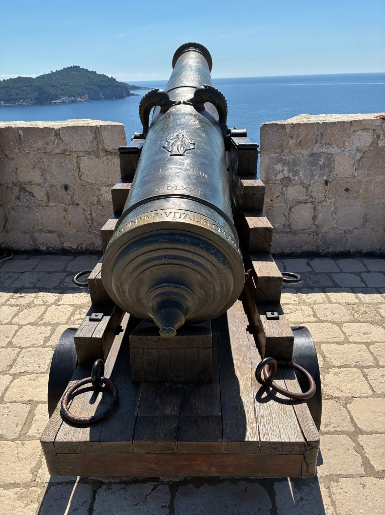 First visit is to Fort Lovrjenac, which is outside the walls of the Old Town. A relatively easy walk – but still lots of stairs, mostly going down. Finding the entry was a bit of a challenge but eventually got there: the paper maps lack detail, and Apple Maps seems to delight in misdirecting D, just like in Spain. Along the way we met Clifford and Oswald, their big sister and their mum, holidaying from Jo’burg. The boys were much more interested in finding tiny hermit crabs than dealing with steps and a stone fort. Mum was originally from Pinaroo (SA); she home-schools the three & recommended visiting Bosnia- Herzegovina (just over the border) …T will think about it.