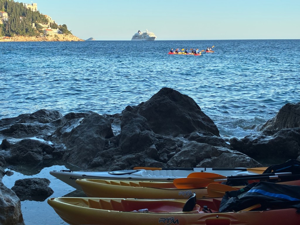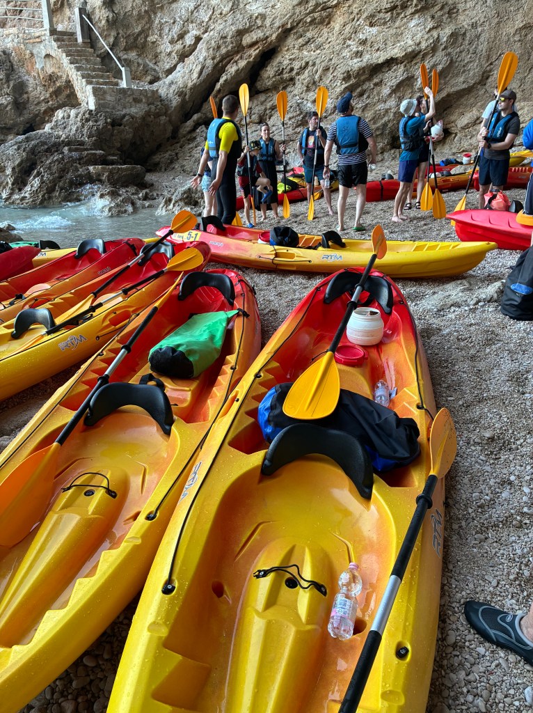 Unfortunately the afternoon breeze had arrived. It would be a bit challenging. Nine kayaks (18 paddlers)…all at least half our age if not more, set out after the safety brief, and issue of life jackets, dry bags, oars, bottles of water….and a trek along a narrow sea wall to the departure beach.