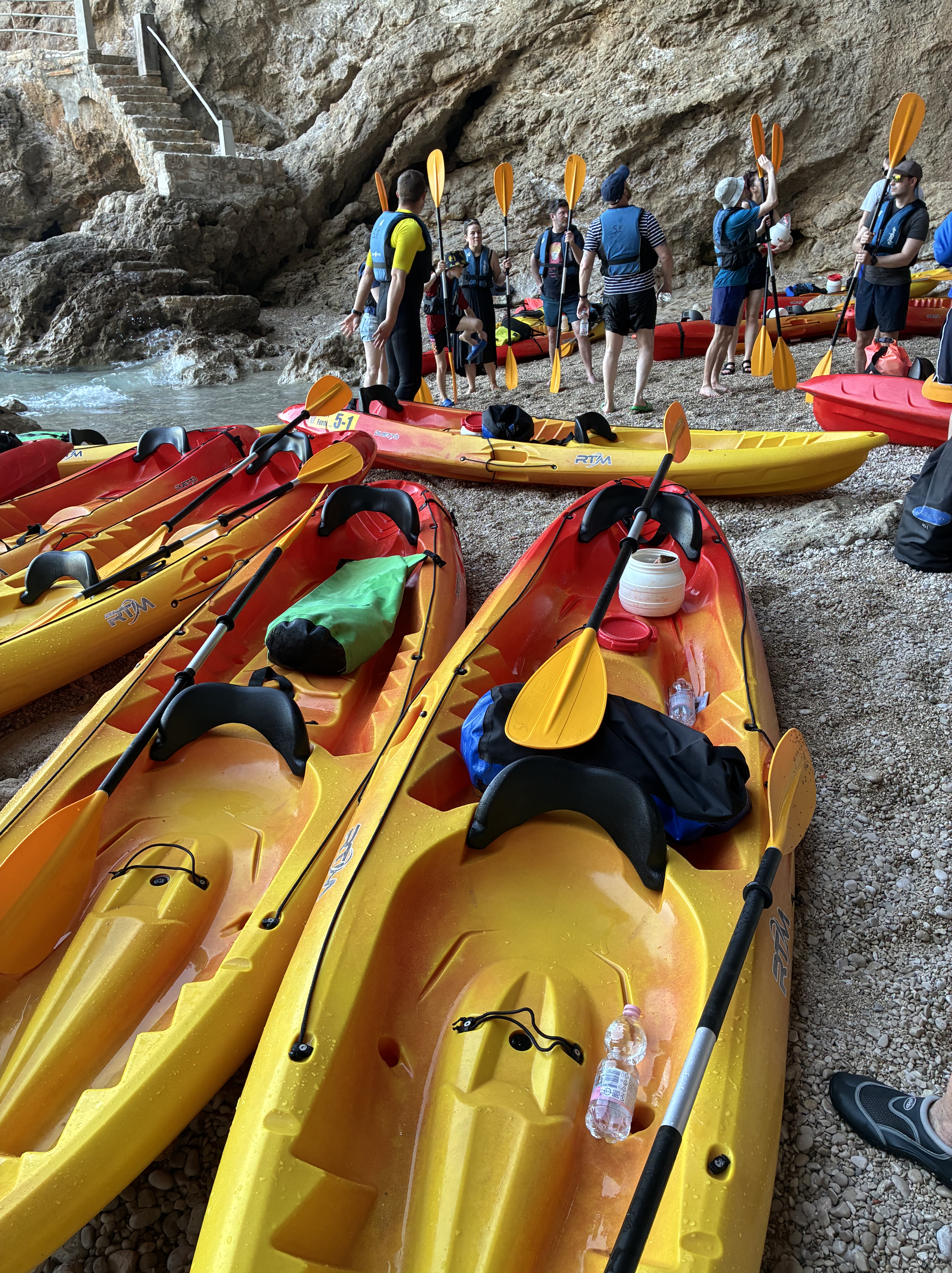 Unfortunately the afternoon breeze had arrived. It would be a bit challenging. Nine kayaks (18 paddlers)…all at least half our age if not more, set out after the safety brief, and issue of life jackets, dry bags, oars, bottles of water….and a trek along a narrow sea wall to the departure beach.