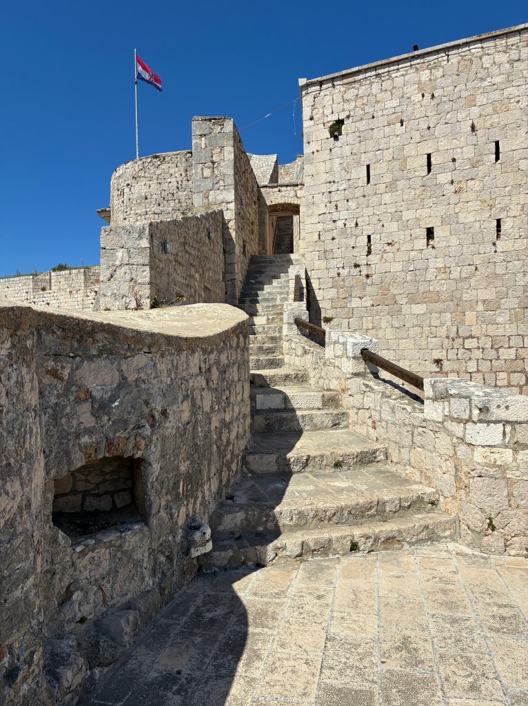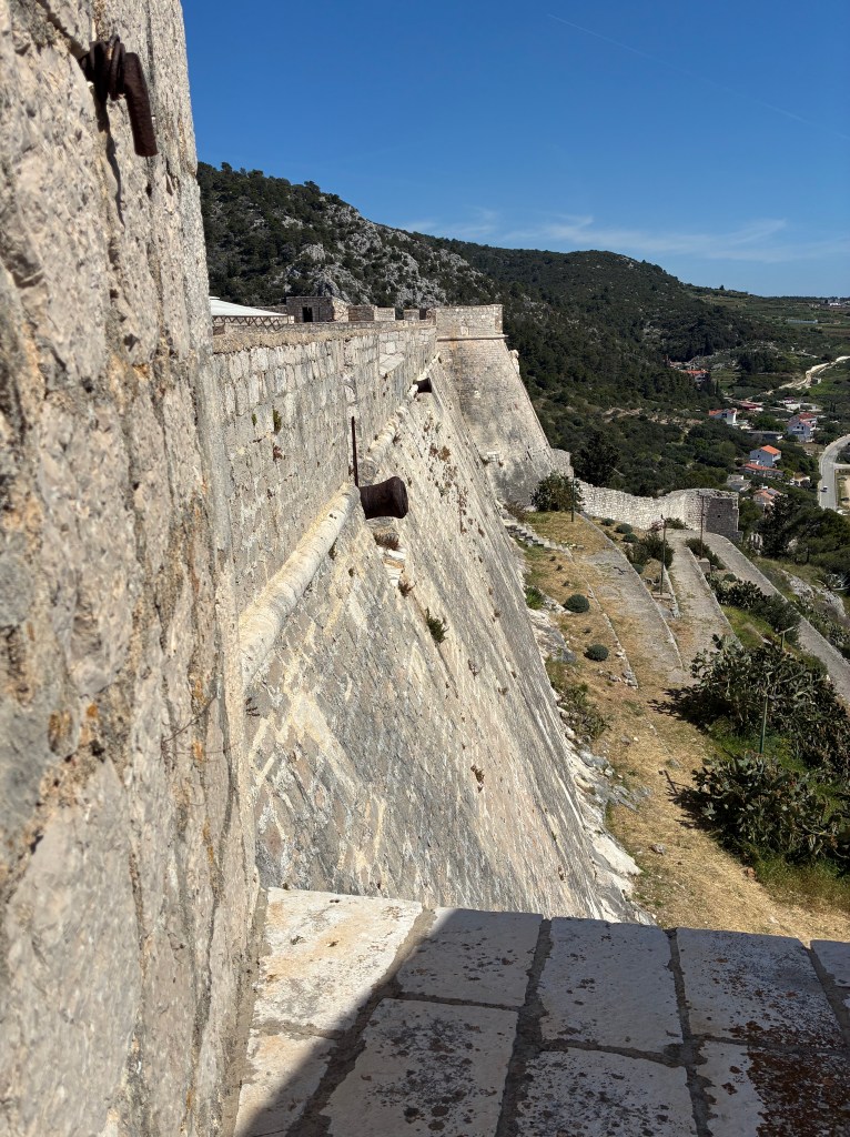 A day to explore the city of Hvar (a village really). First challenge after coffee was the walk to the Fortica (also known as Spagnola) a overlooking the city. Fortunately, after getting to the city centre, the walk up the hill, although looping, was a flat zig zag surface through a Mediterranean garden of pine trees, lavender, irises, herbs & succulents. It was a very slow day for lavender sellers and Fortress staff but for us it was perfect.
