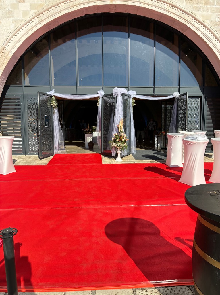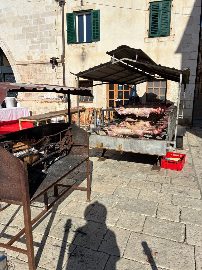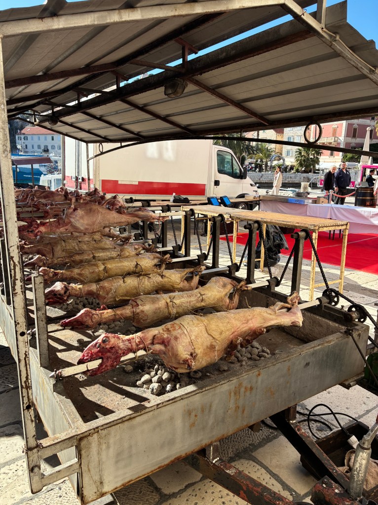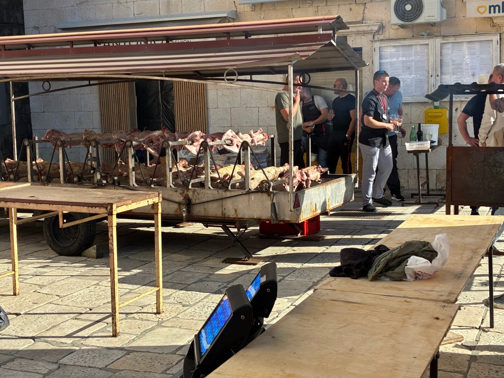 Back toward the town square: we’d noticed earlier in the day that an event was being prepared in the Arsenal; with flowers and white organza draped, white cloths over tables, it looked like a serious Saturday wedding would happen. By afternoon, the lamb spits were being finalised & the guys were rewarding themselves with glasses of white & loud chatter…it was actually the Hvar Wine Festival event, starting at 5pm.