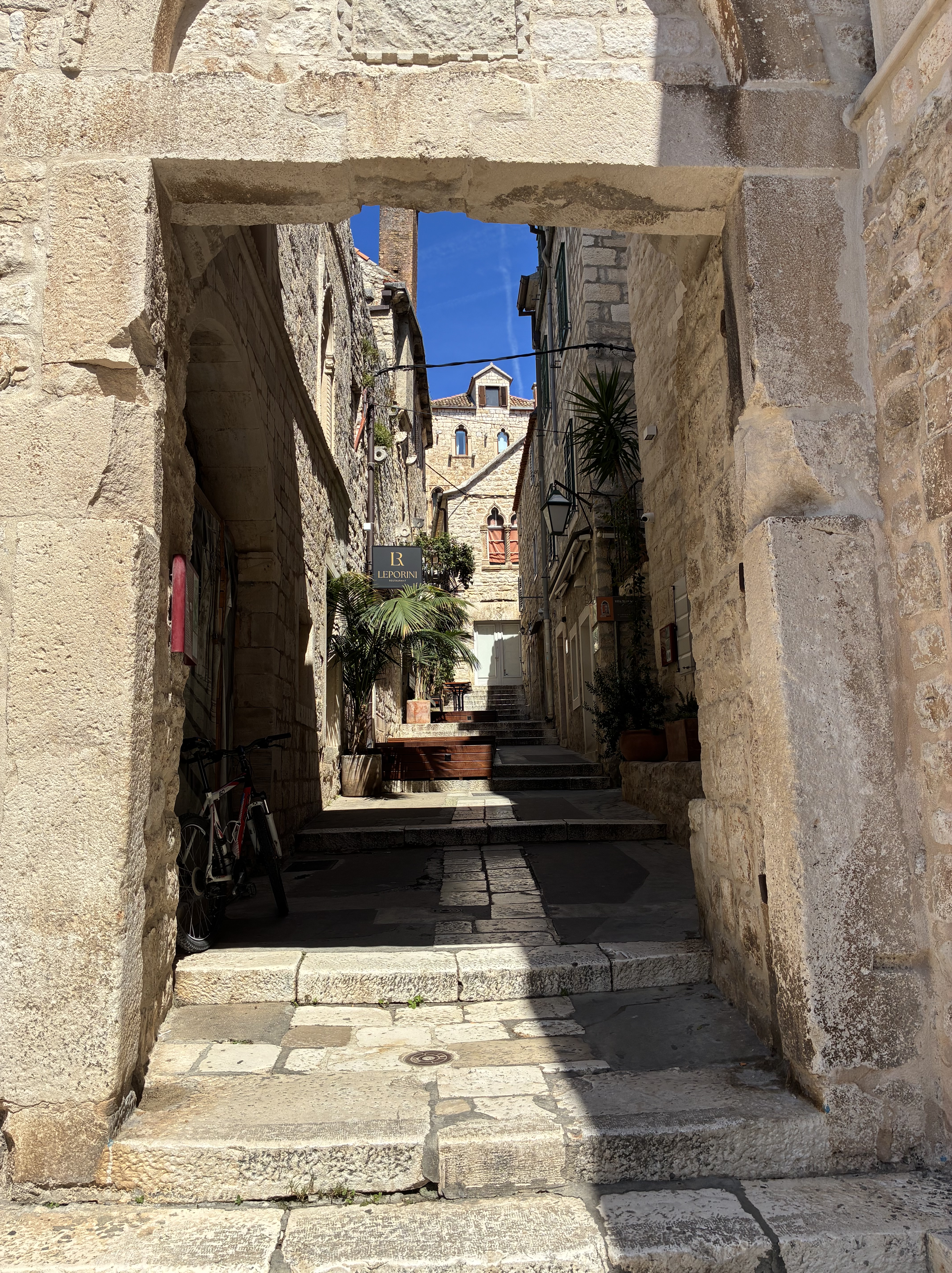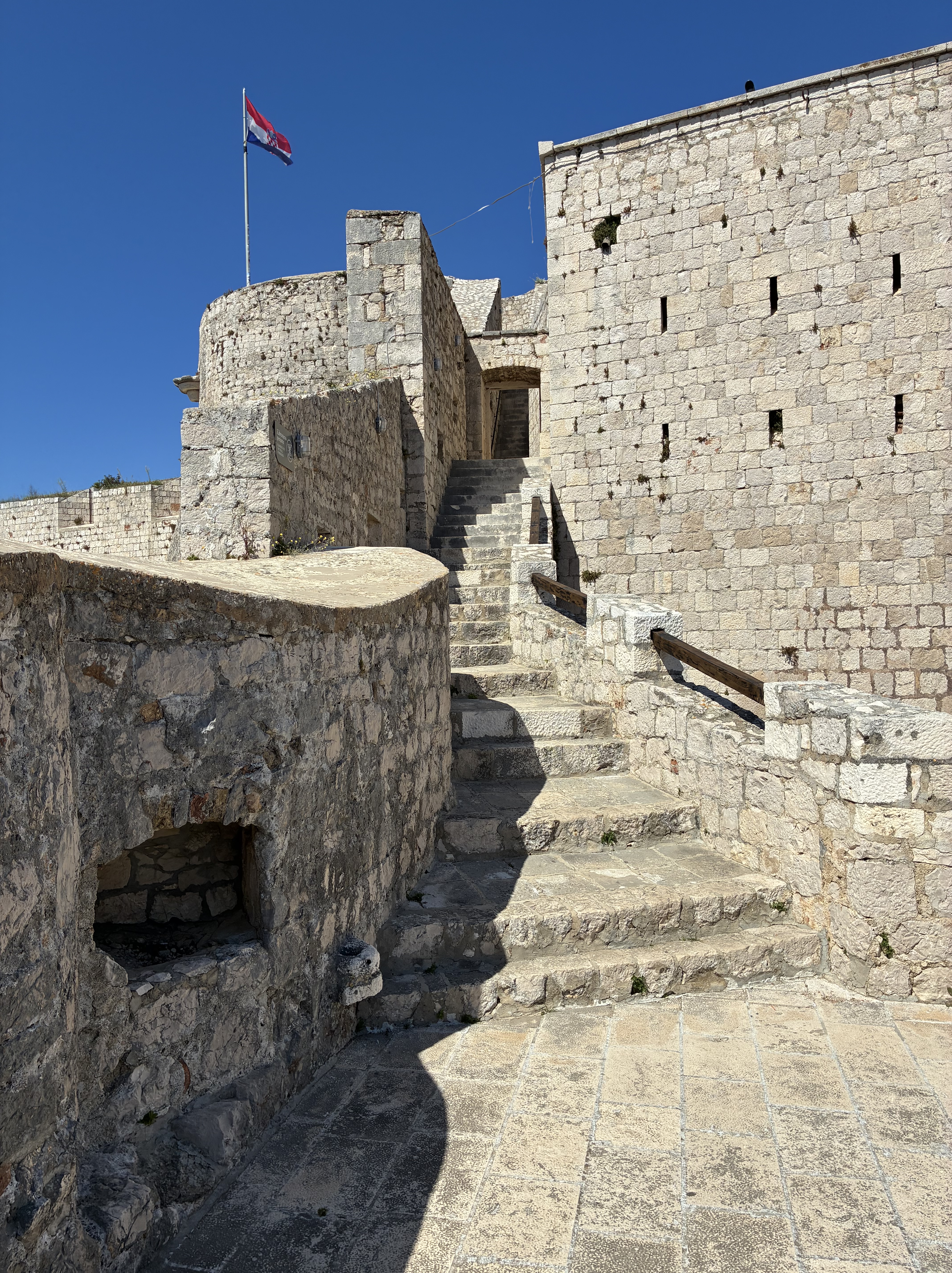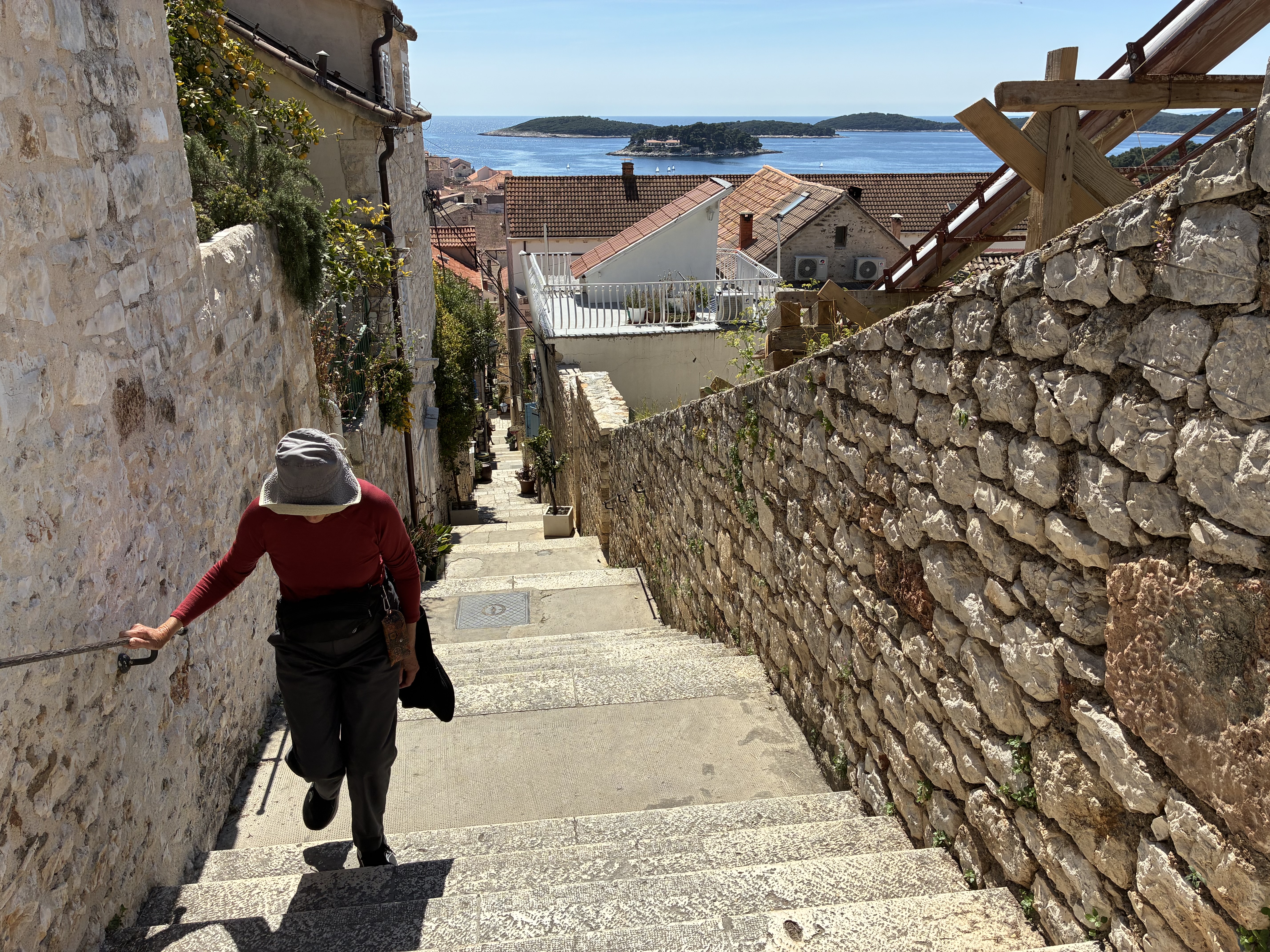 A day to explore the city of Hvar (a village really). First challenge after coffee was the walk to the Fortica (also known as Spagnola) a overlooking the city. Fortunately, after getting to the city centre, the walk up the hill, although looping, was a flat zig zag surface through a Mediterranean garden of pine trees, lavender, irises, herbs & succulents. It was a very slow day for lavender sellers and Fortress staff but for us it was perfect.