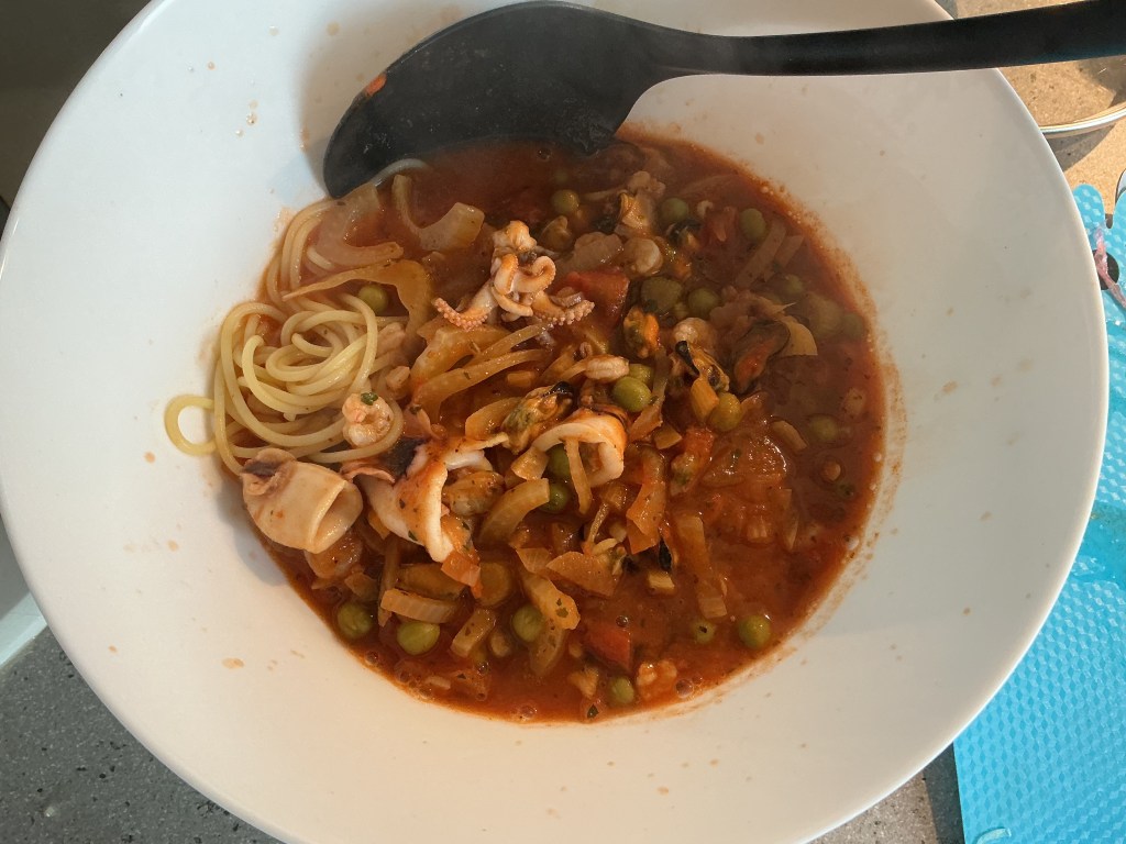 Dinner preparation of a Mediterranean style seafood pasta dish had started the previous night. Delicious.