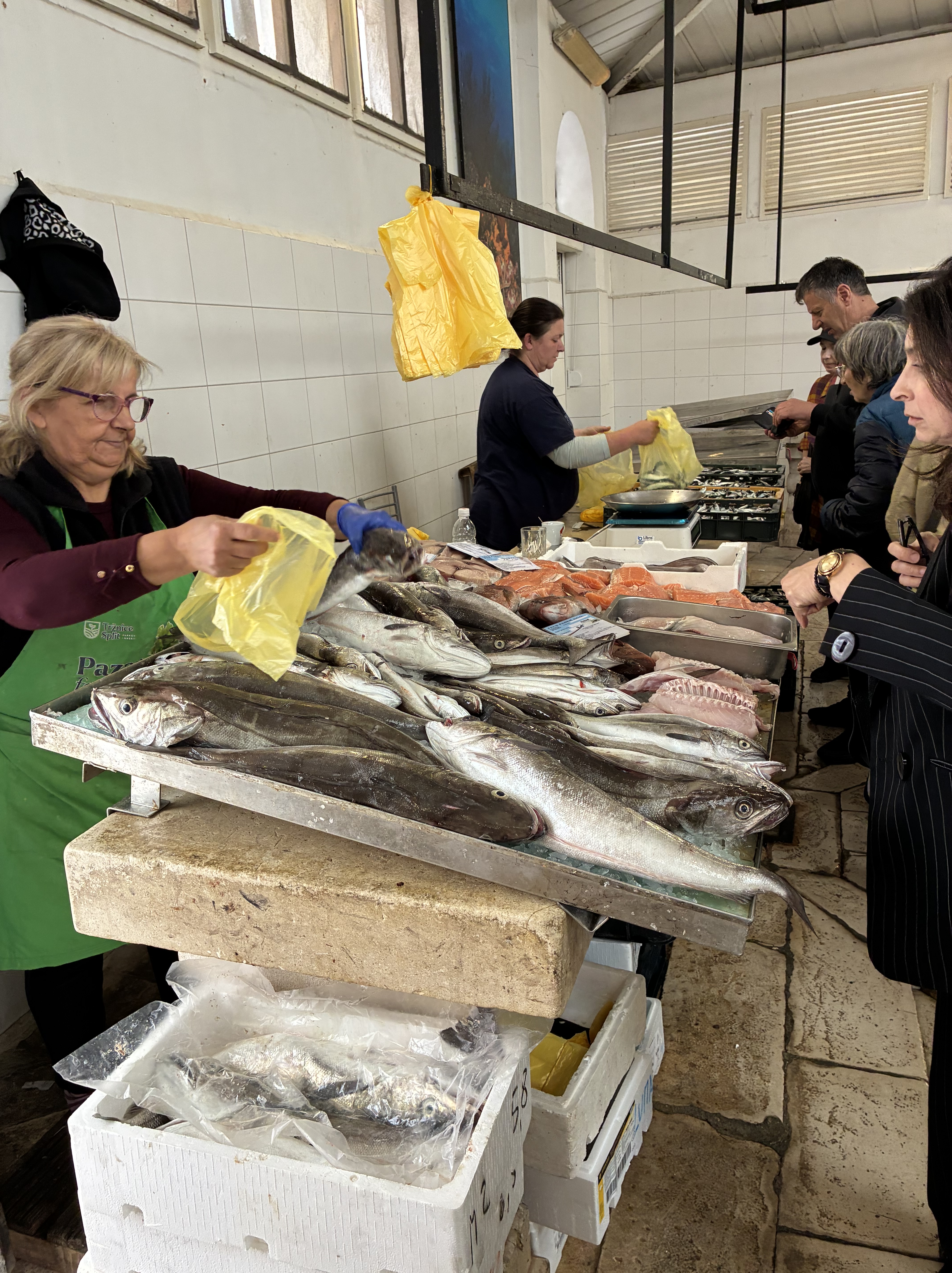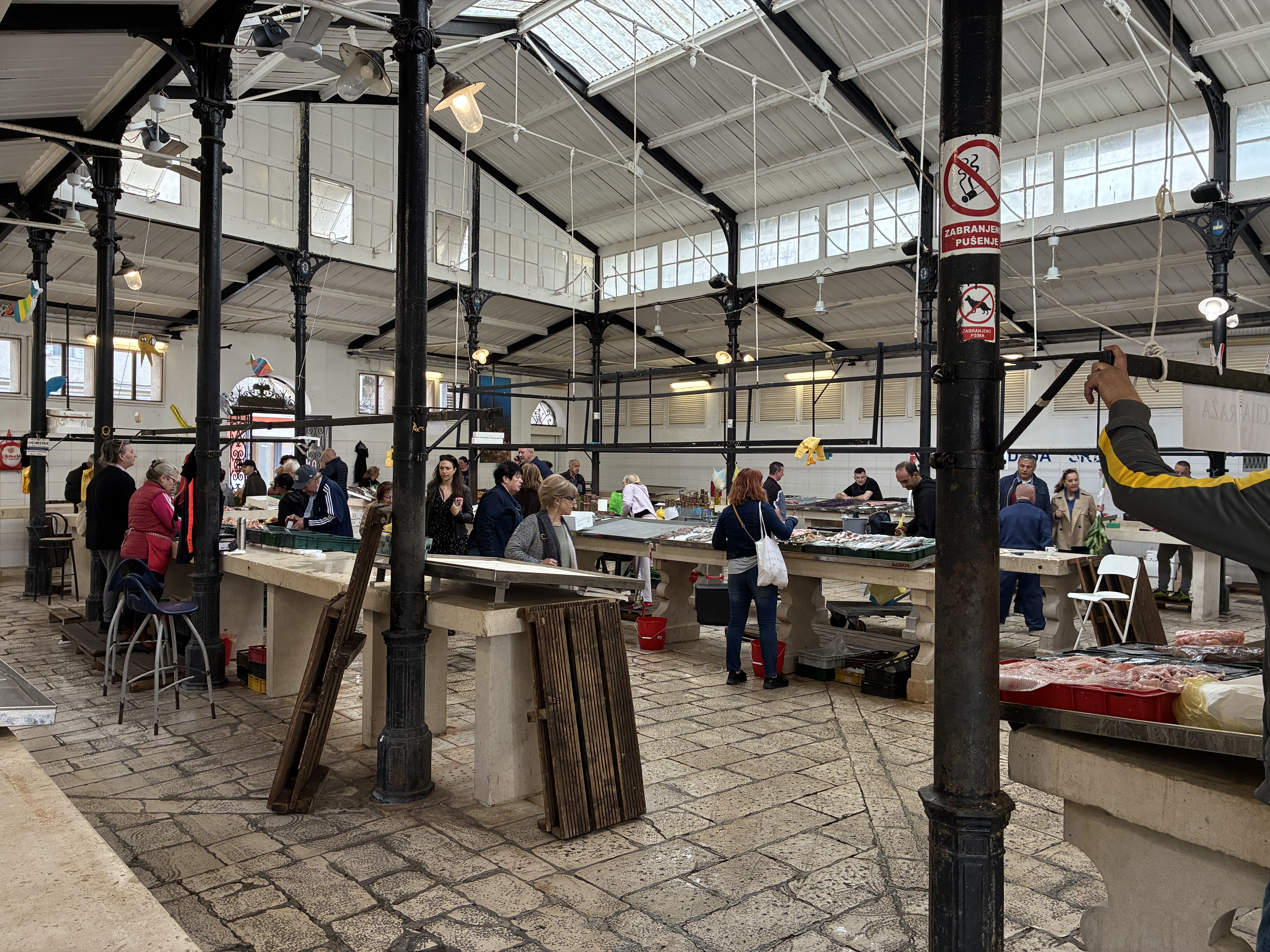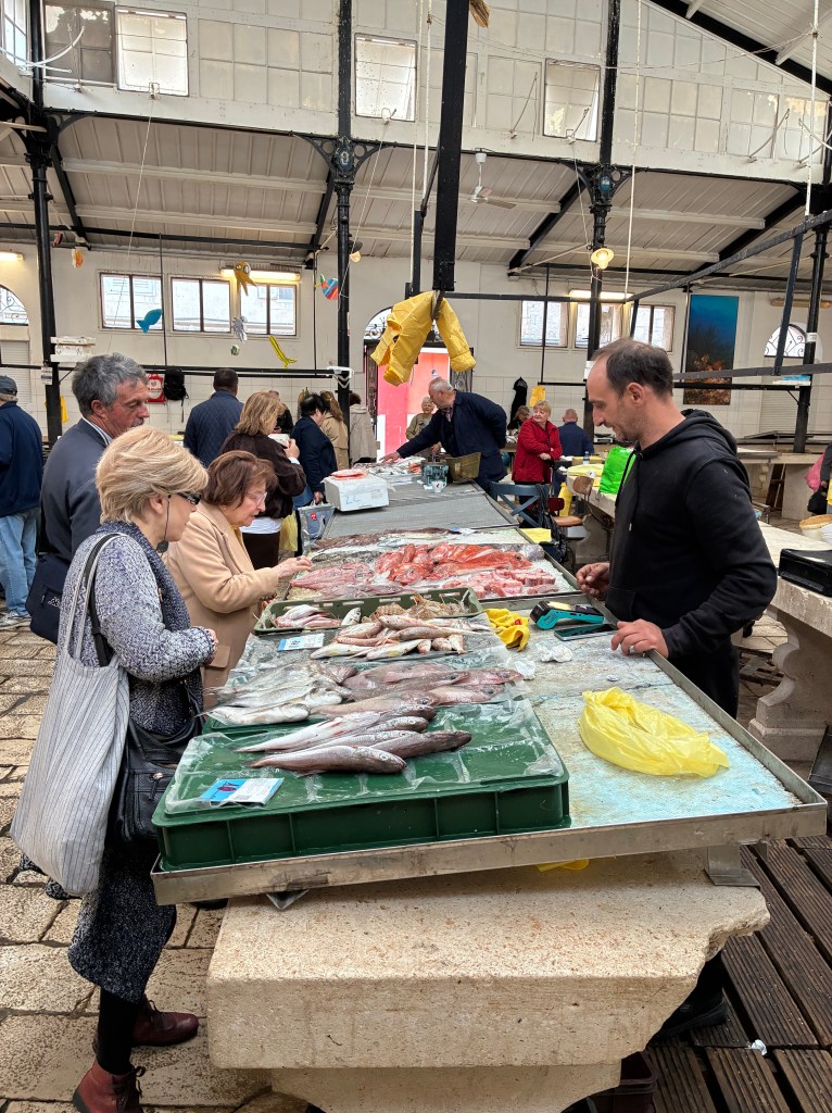The mix of eateries & bars is interesting: you can have coffee but no food, pastries but no coffee…We settled on a sweet custard pastry from a bakery after a coffee (finally, getting brown sugar), then later for lunch it was a couple of tasty filled rolls. Within the narrow alleyways, fashion, shoe & souvenir shops were open. And a first: a FISH MARKET!