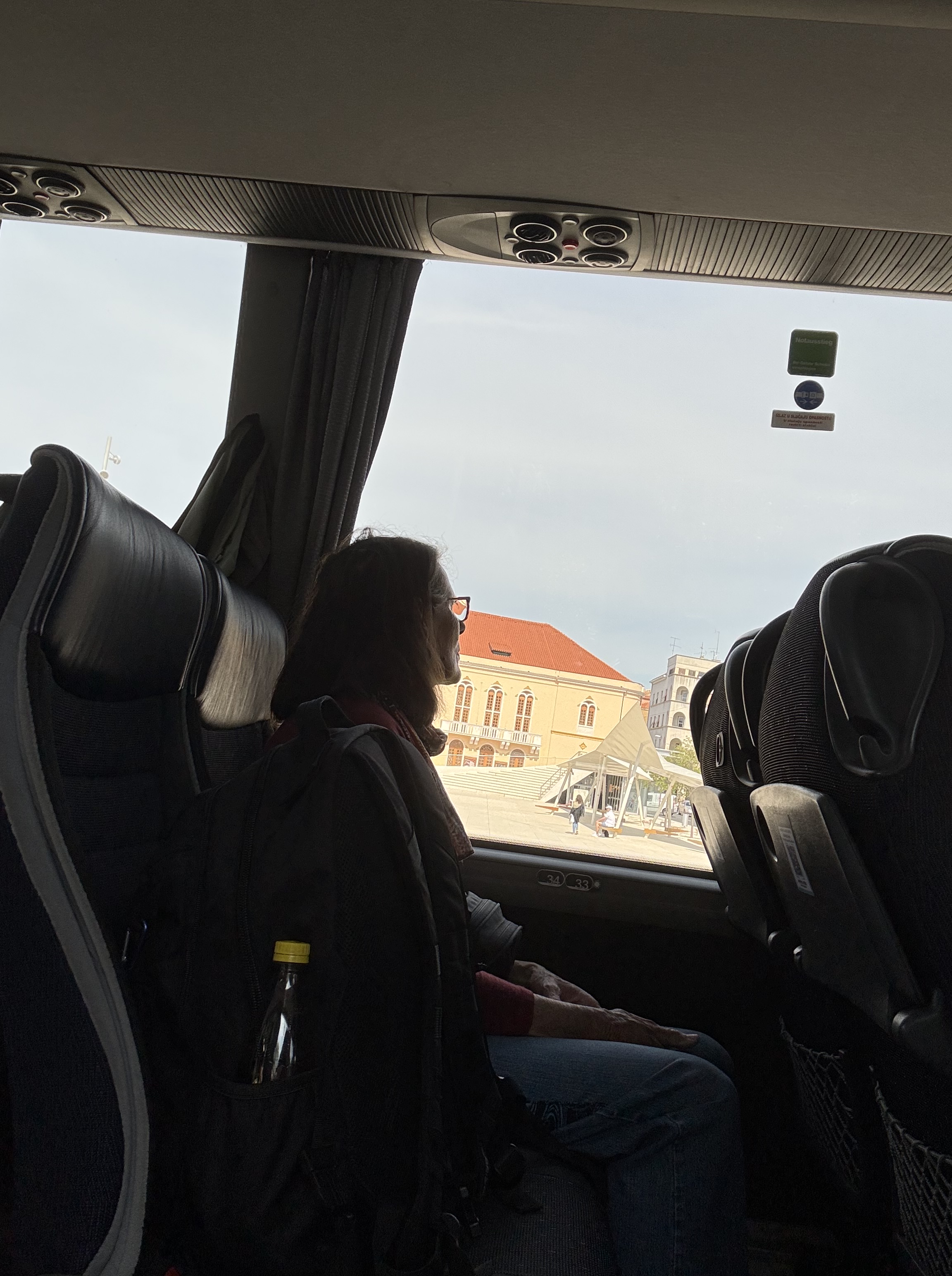 Nicotine is still fashionable for all ages and our bus driver was desperate as he pulled into Šibenik with fag poised, closing the doors so he could exit for that fix, much to the consternation of the baggage handler. He wasn’t the only one: a couple of passengers needed the same. Our bags were stowed (2.6 euros extra please) & we boarded, choosing seats on the driver’s side (for the best view). At some point D wondered if we were in the right seats: were they actually allocated? Nobody else seemed to be concerned. When he checked, seats were in fact allocated, but as someone else was in ours…what the heck. A woman nearby started coughing & continued…D initially hoped it was a smoker’s cough, but suspected after sustained coughing that it was something else. Fingers crossed.