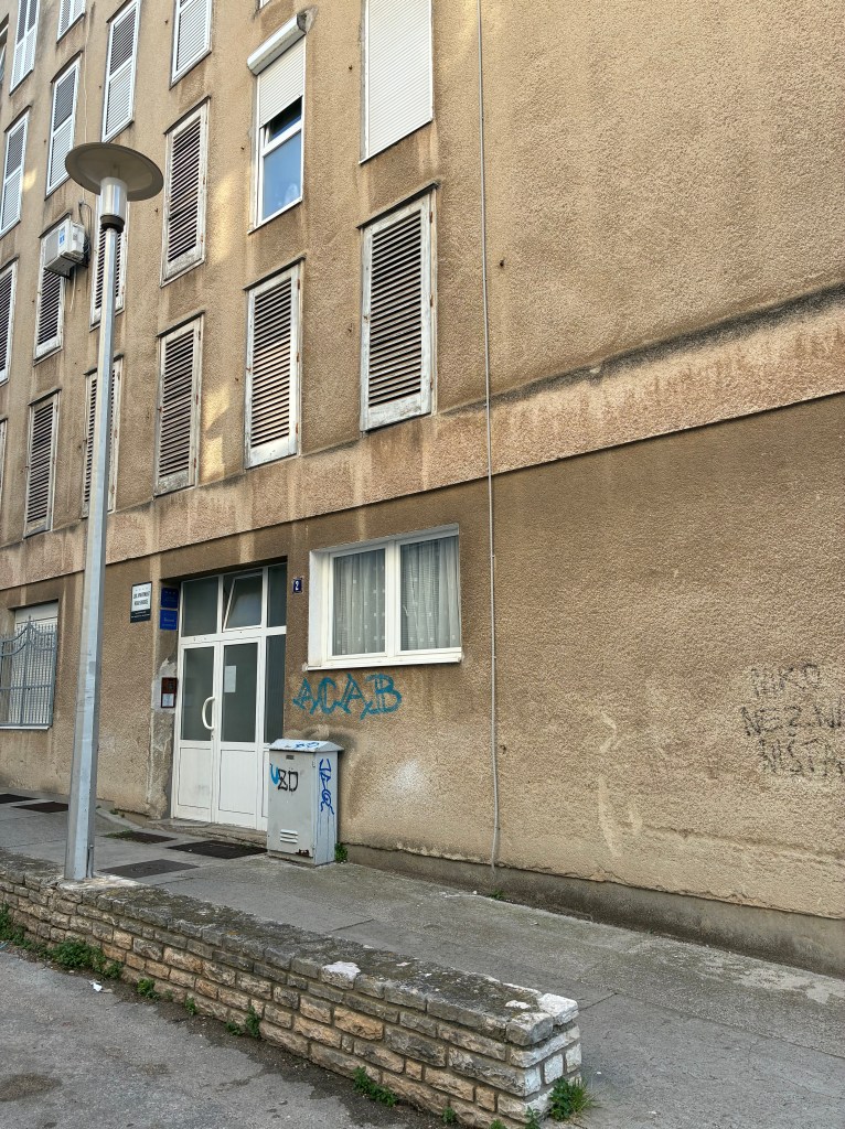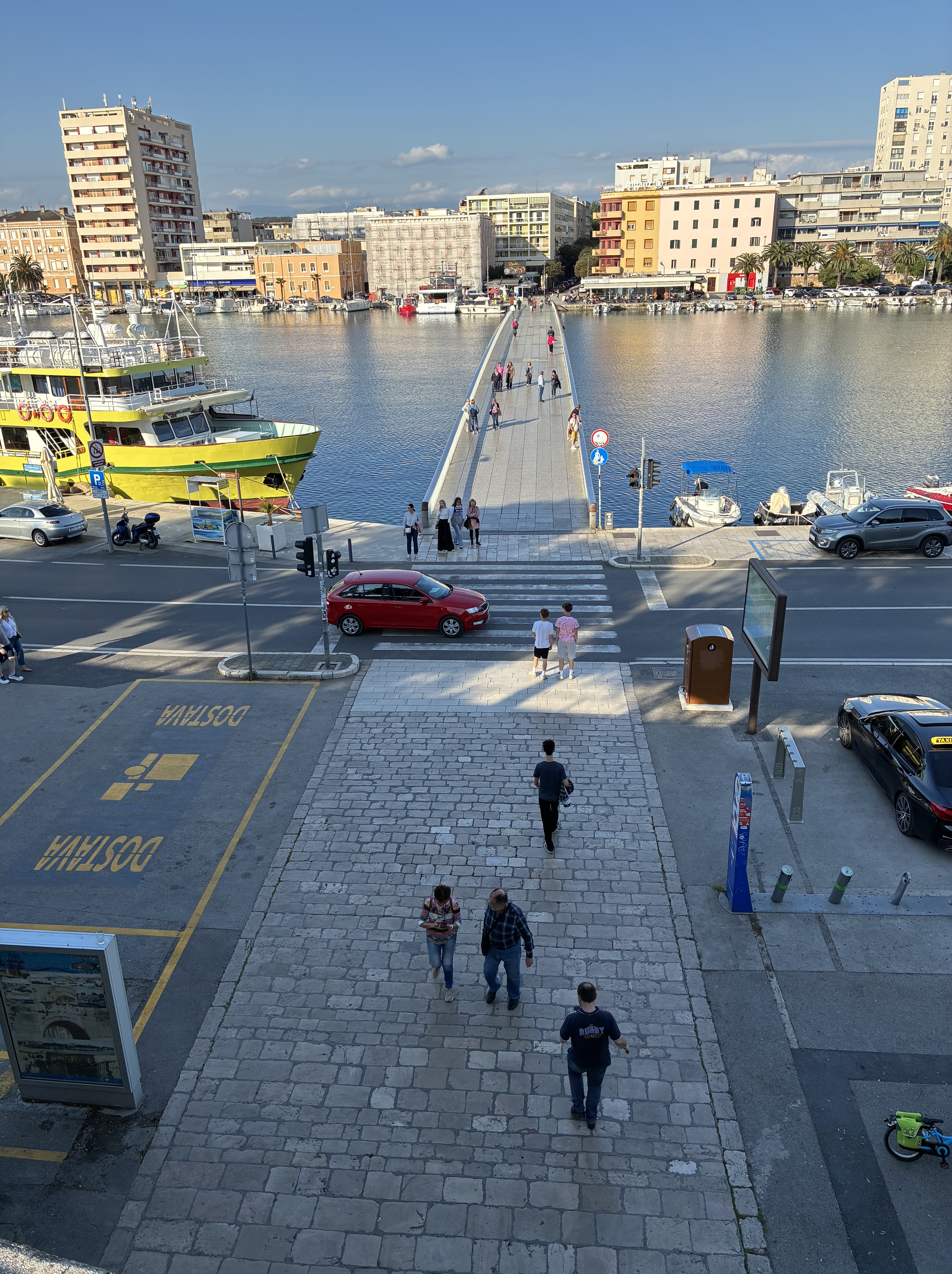 The route was not spectacular (T had hoped for amazing scenery). And then we were at Zadar, a big concrete bus station and the taxi tout was onto us. There was no question of our walking the 2 kms to our abode so we took up his offer. We are in an unpretentious (ugly) building one street back from the waterfront and very near the footbridge across to the old town. The apartment is at ground level!! And inside is beautifully new and appointed, just as described.