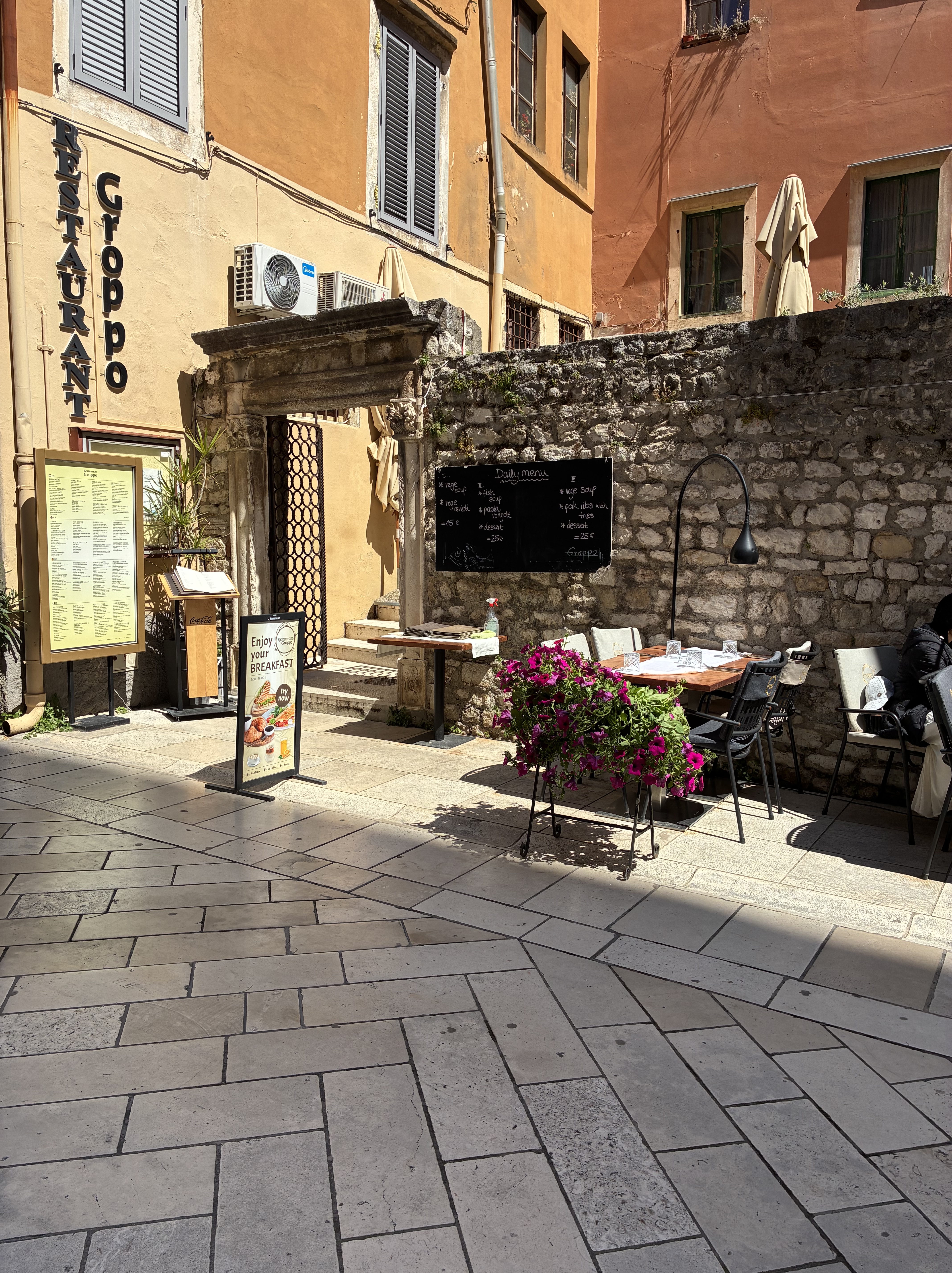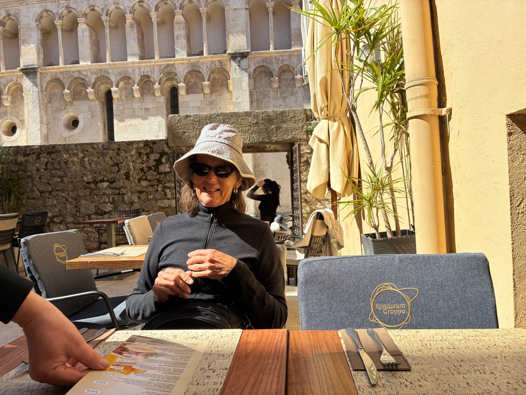 Somewhat distracted by conversation, T ordered the Dalmatian breakfast for two: tuna pate, shrimp, aragula, eggs, tomatoes, toast. What wasn’t mentioned was that the eggs were fried and there were three each – and when the plates arrived, to T’s dismay she had forgotten to ask for no eggs. D was faced with a choice!