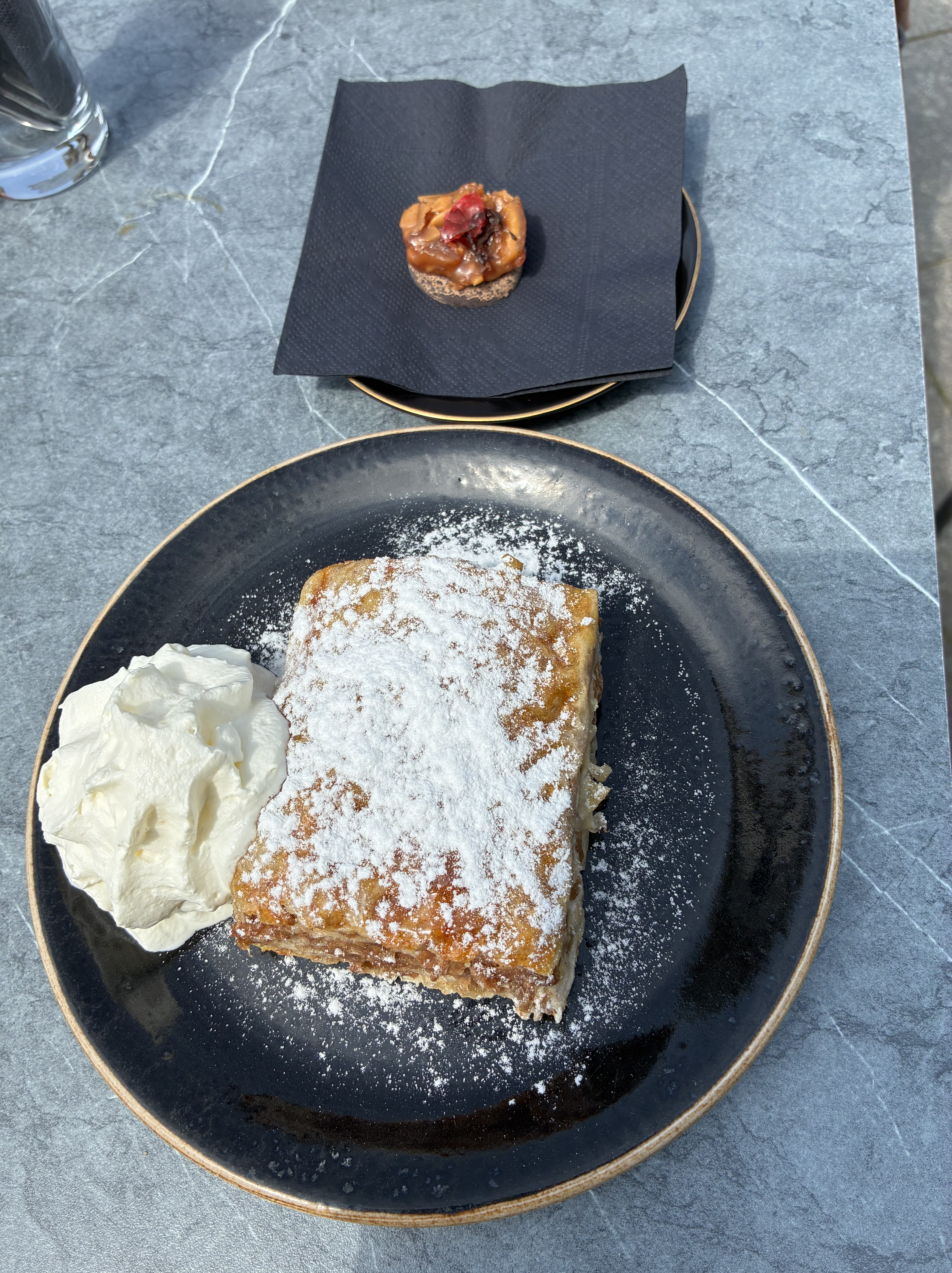 It arrived fairly quickly at Ljubljana Castle where we alighted. A coffee to get us kick started – T ordered a Florentine, D ordered the Apple Strudel.